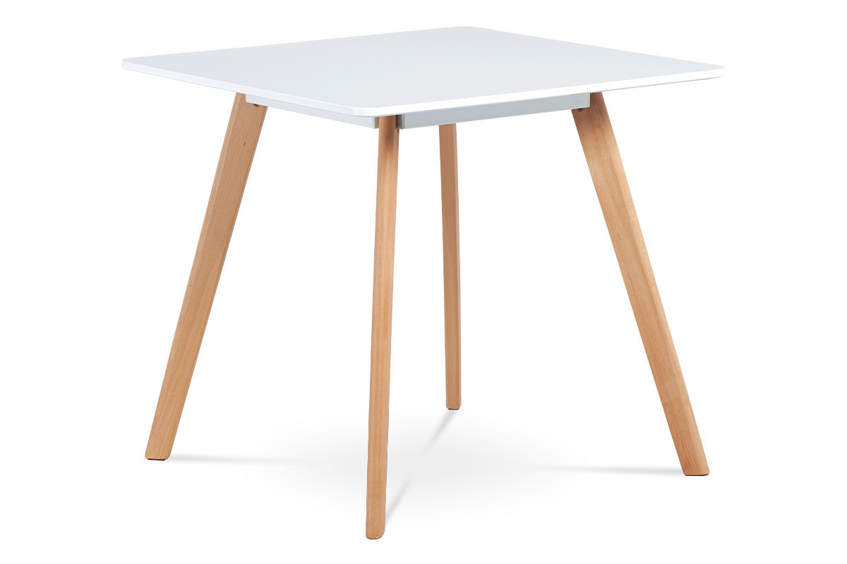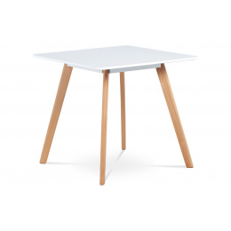 Moderný jedálenský stôl so štvorcovou doskou z MDF, ktorá je natretá matnou bielou farbou a je vysoká 2 cm. Podstavec z masívneho bukového dreva v prírodnom odtieni je vybavený penovými klzákmi a rozteč nôh je 42 a 42 cm.