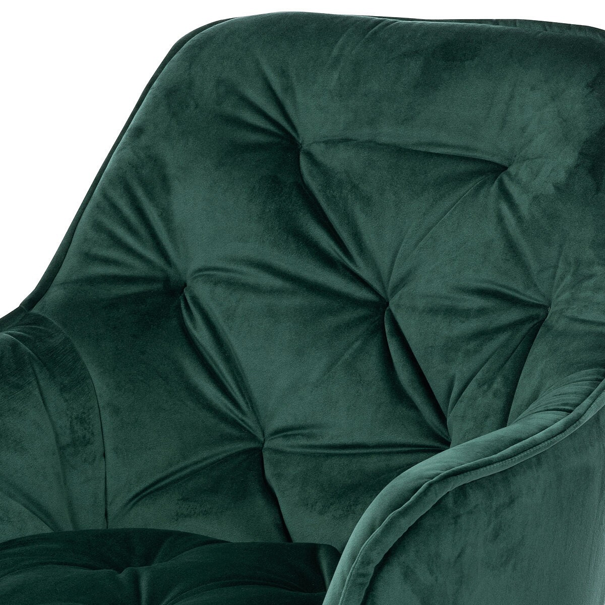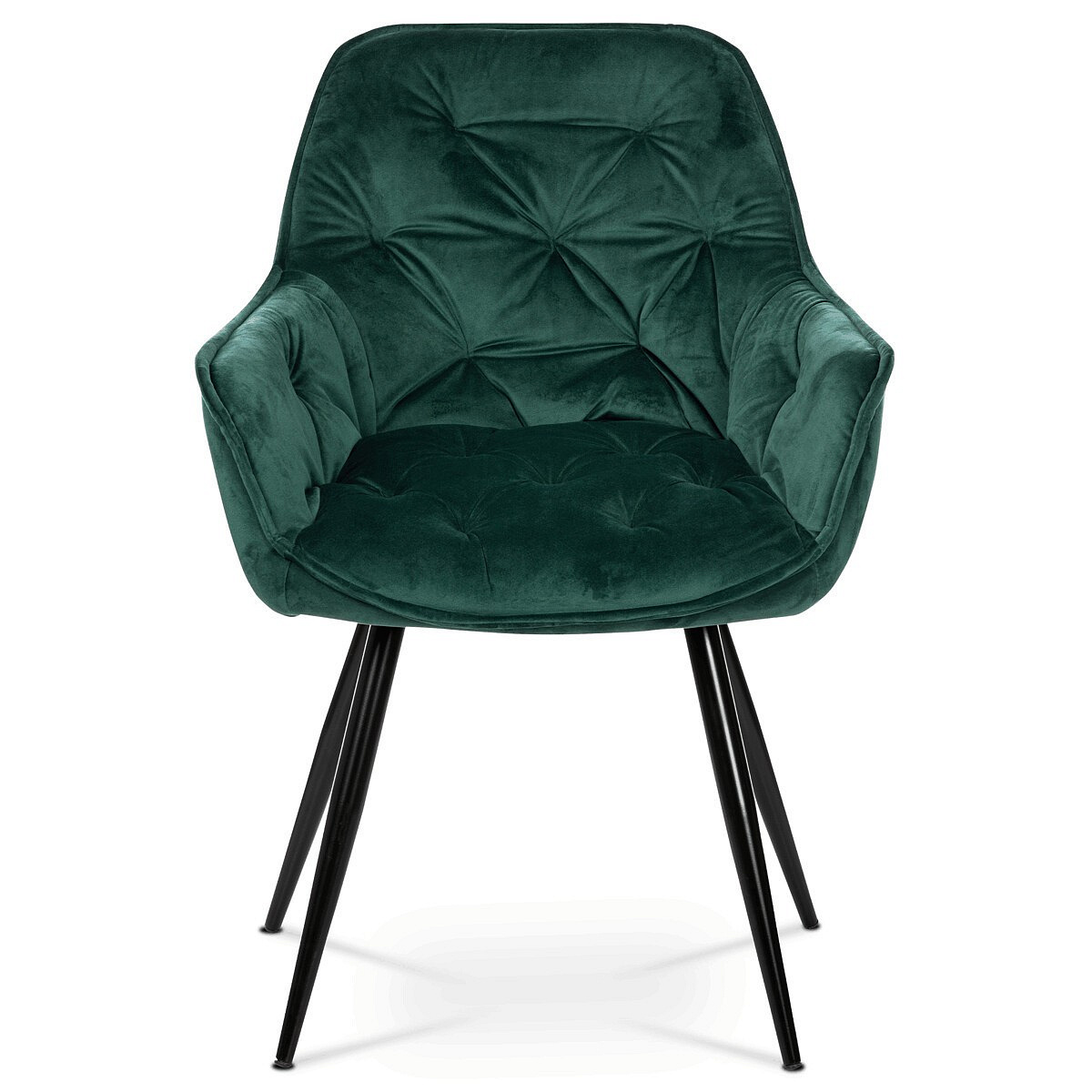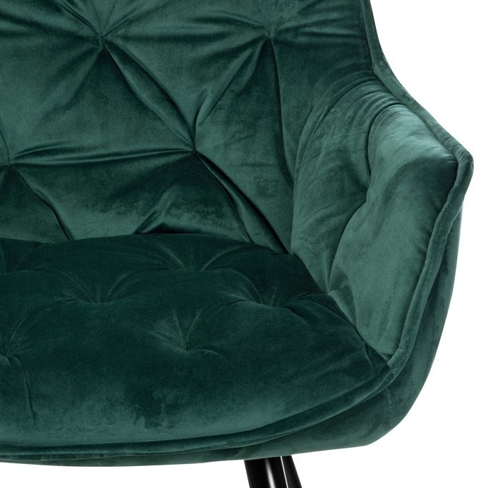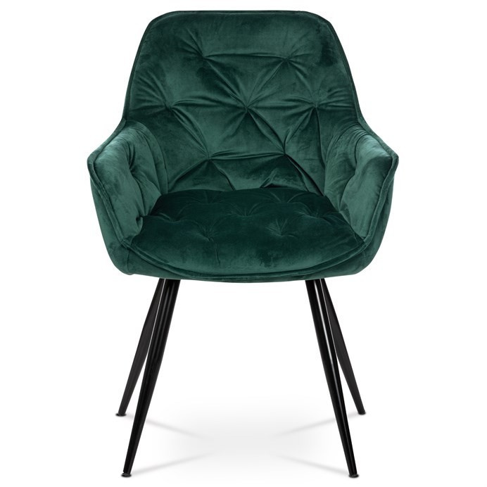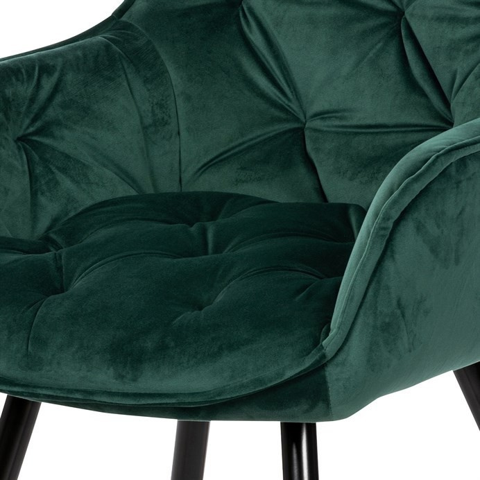 Táto stolička v industriálnom štýle je vďaka svojmu dokonalému dizajnu neprehliadnuteľná a zároveň veľmi pohodlná. Škrupina sedadla a operadla je potiahnutá kvalitnou látkou v módnom zamatovom odtieni fľaškovo zelenej farby. Výplň je vyrobená z PU peny. Veľmi dekoratívnym prvkom je výrazné masívne štvorcové prešitie sedacích častí vo farbe poťahu a pásu okolo celej škrupiny. Vybraná tkanina sa tiež veľmi ľahko čistí. Stabilitu stoličky zaisťujú štyri kónické kovové nohy s kvalitnou práškovou povrchovou úpravou v matnej čiernej farbe. Sú zakončené čiernymi plastovými klzákmi, ktoré zabraňujú poškodeniu tvrdých podlahových povrchov. Vďaka týmto dizajnom je tento model stoličky skvelou voľbou na zariadenie obývacích izieb alebo jedální, ale aj zasadacích miestností. Nosnosť stoličky je 110 kg.