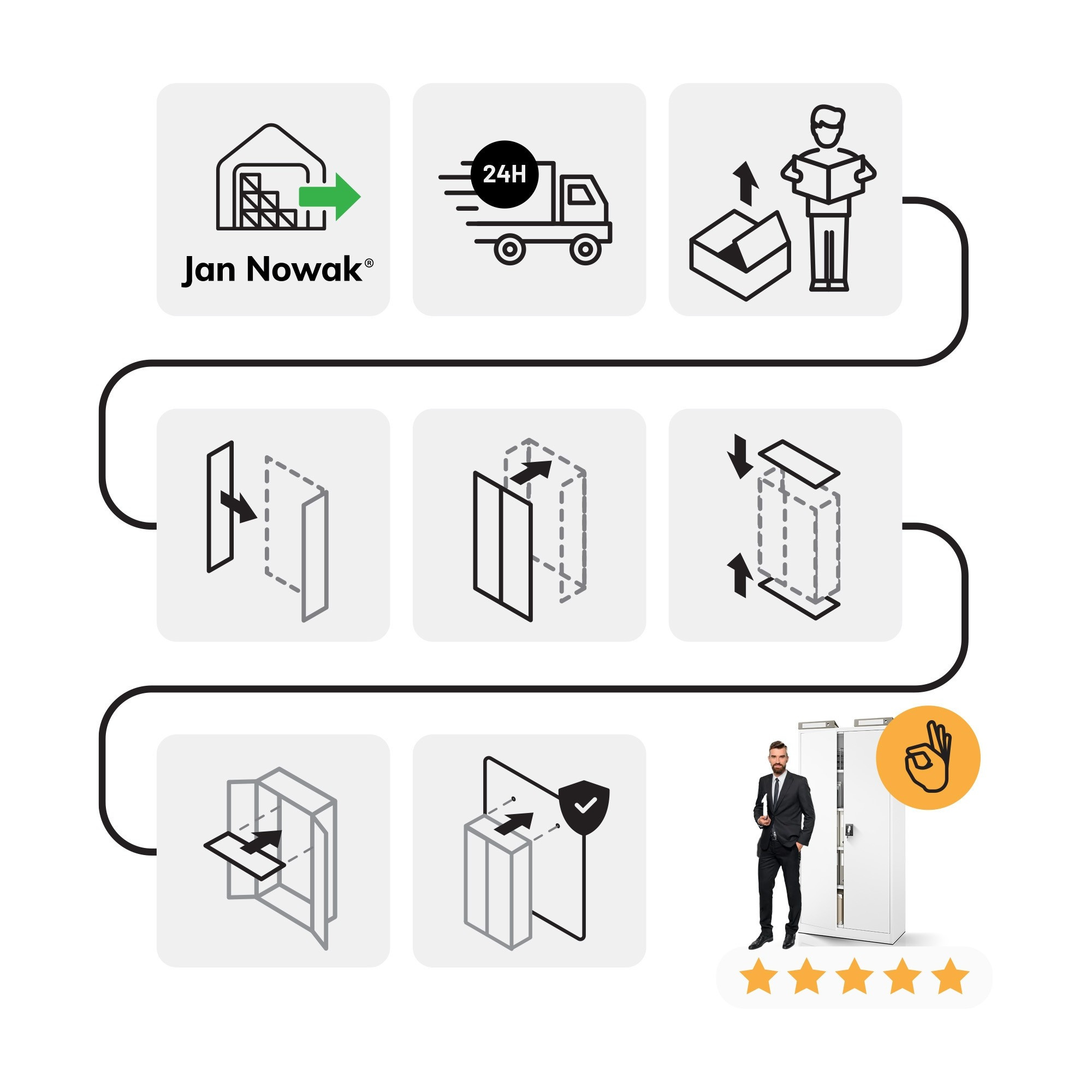 Bezpečnosť vašich uložených vecí je pre nás prioritou. Preto je skriňa JAN H vybavená dvojkrídlovými dverami so zámkom uzamykateľným v 3 bodoch. K skrini obdržíte 2 kľúče, takže budete mať vždy istotu, že vaše dokumenty, lieky alebo náradie sú v bezpečí.