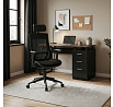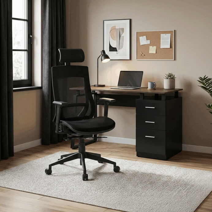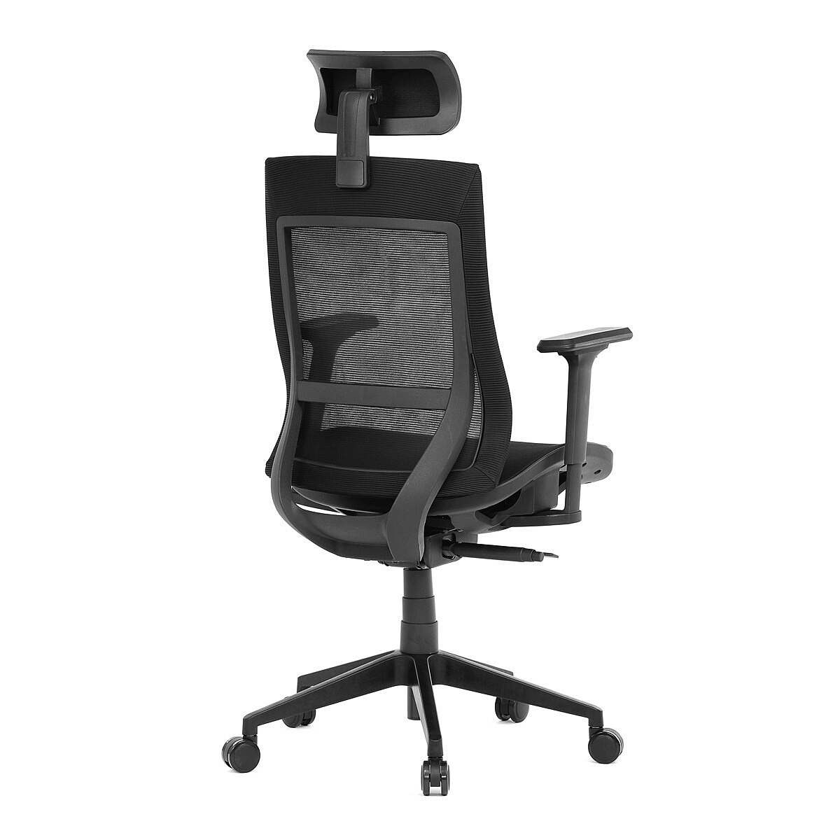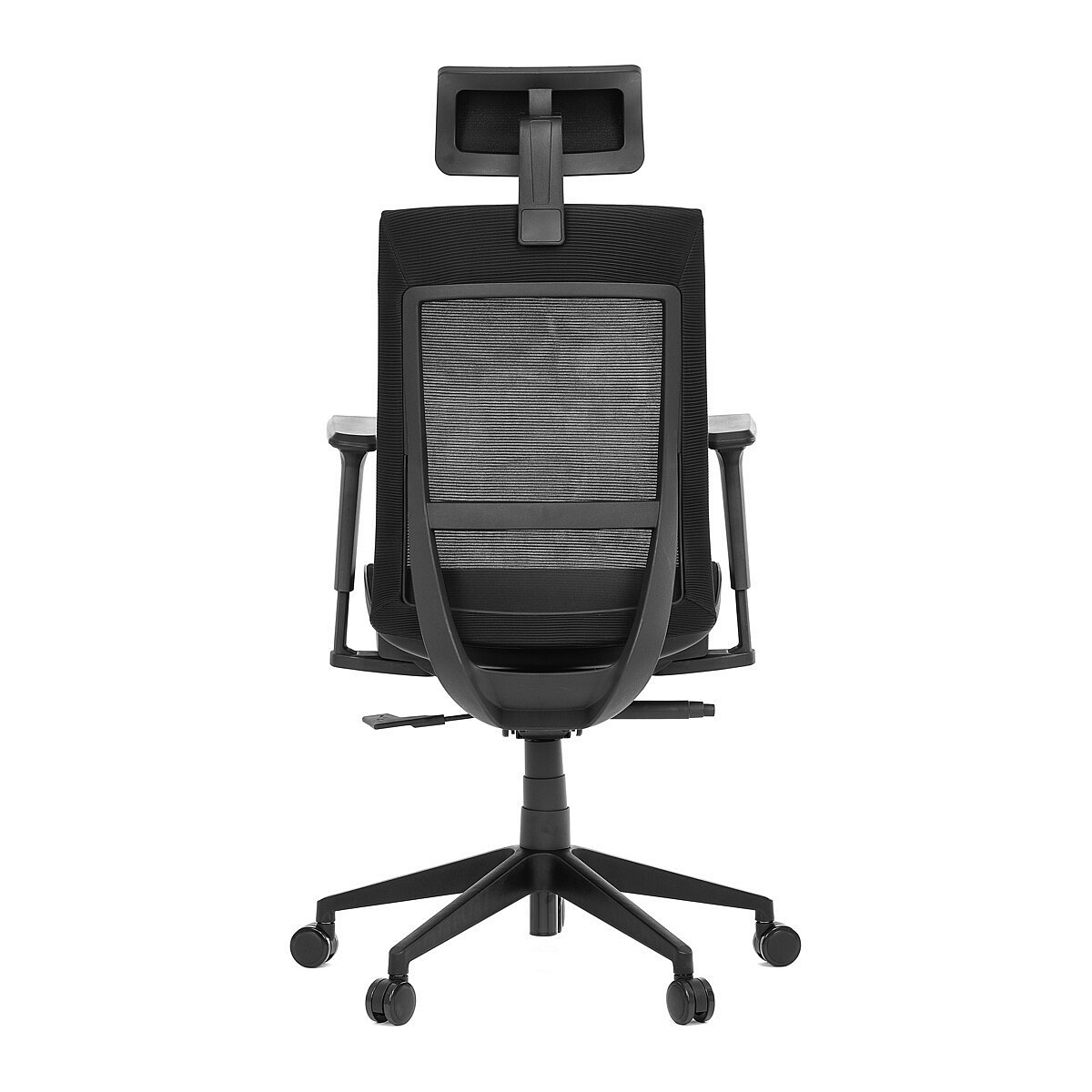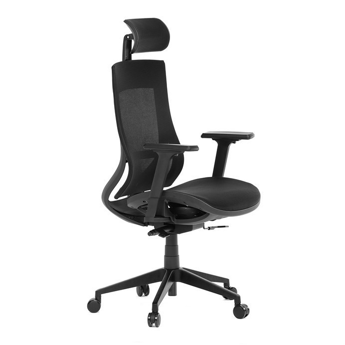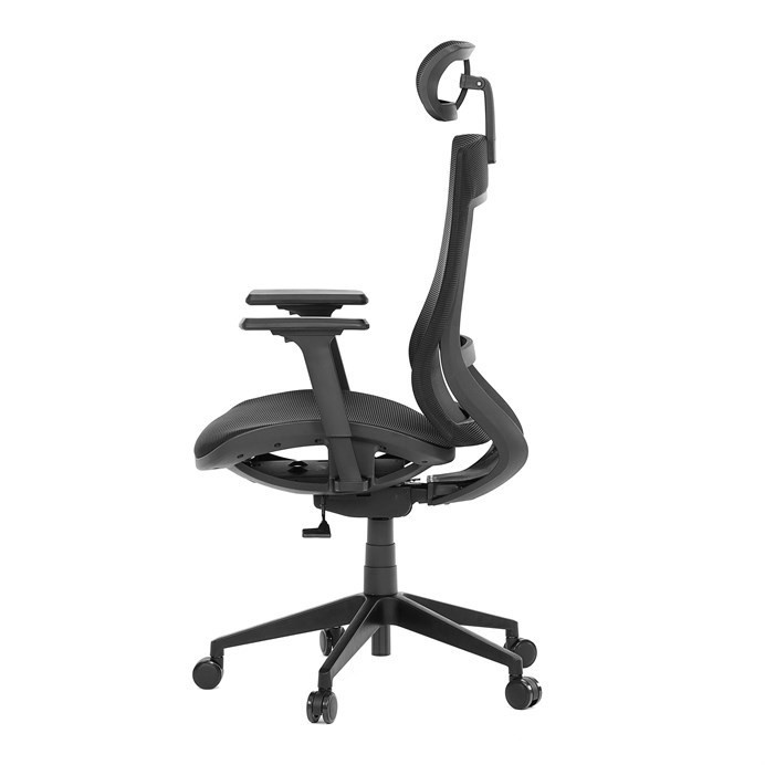 Kancelárske kreslo v čiernej látke. Kríž, rám a podrúčky sú vyrobené z odolného čierneho plastu. Sedadlo s funkciou posúvania dopredu/dozadu. Podrúčky sú výškovo nastaviteľné. Stolička má kolieska na tvrdé povrchy.