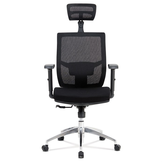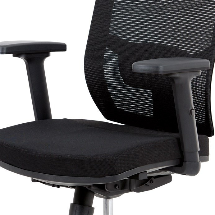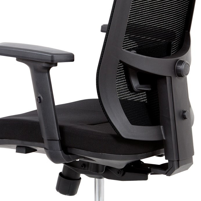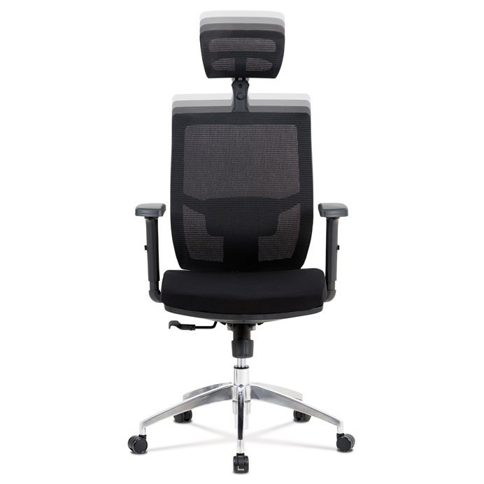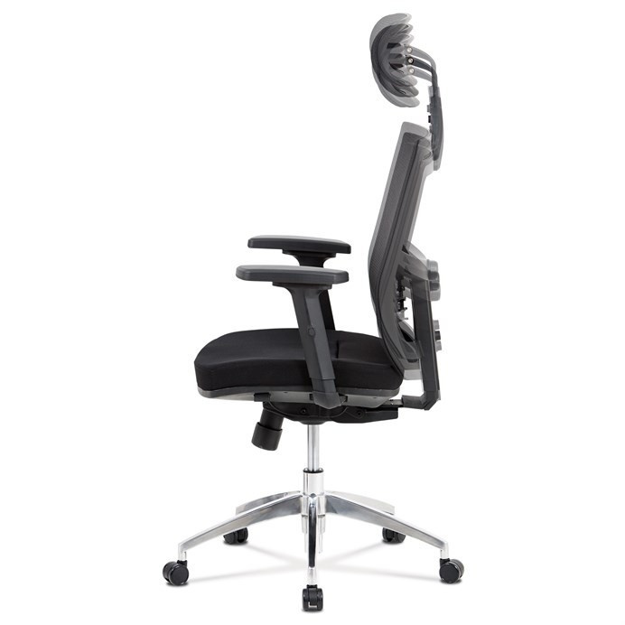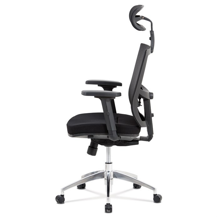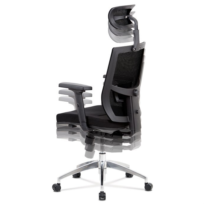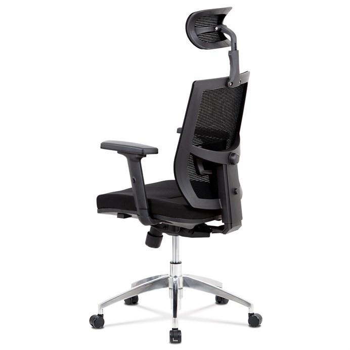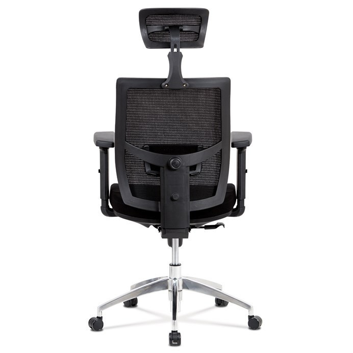 Kancelárska stolička s operadlom z čiernej sieťoviny MESH a sedadlom z čiernej látky. Stolička je výškovo nastaviteľná, vybavená synchrónnym mechanizmom. Plastové podrúčky sú nastaviteľné a výškovo nastaviteľné (2D). Výškovo nastaviteľné je aj operadlo. Vďaka malej páčke môžete sedadlo polohovať nezávisle dopredu alebo dozadu. Sieťovina, výškovo nastaviteľná a polohovateľná opierka hlavy a nastaviteľná bedrová opierka. Leštený hliníkový kríž s pogumovanými kolieskami vhodný na tvrdé podlahy.