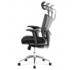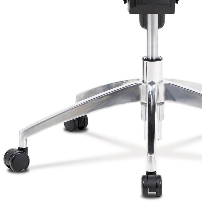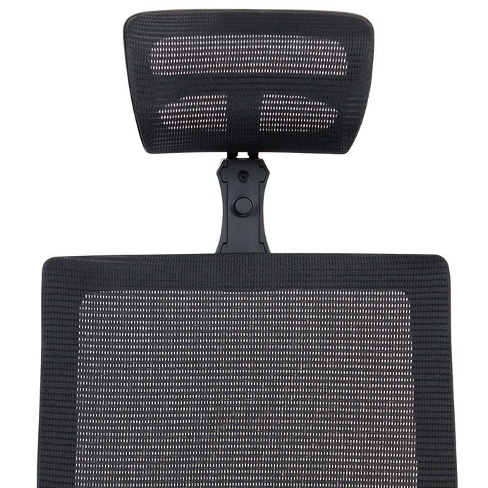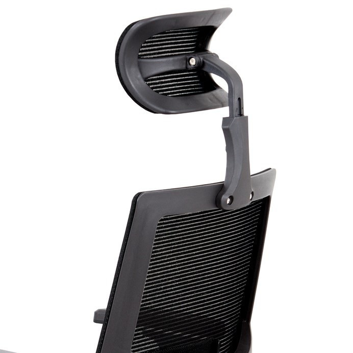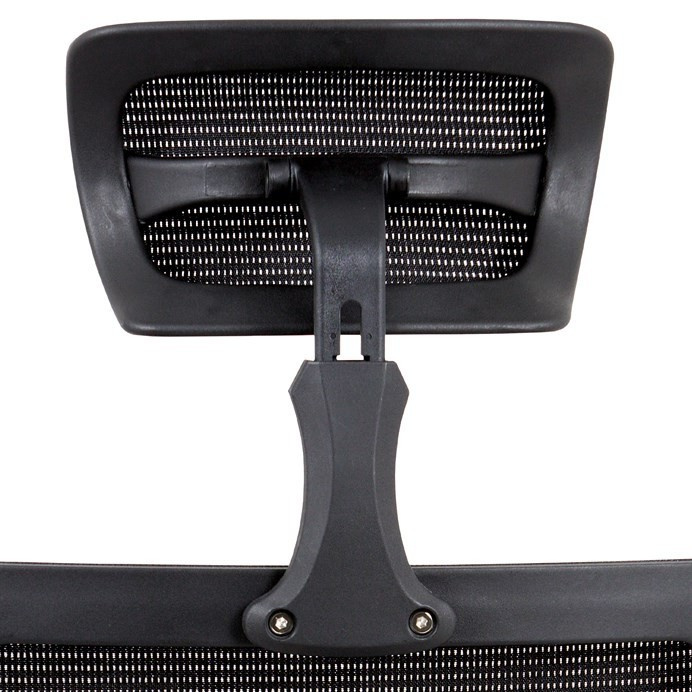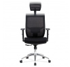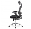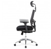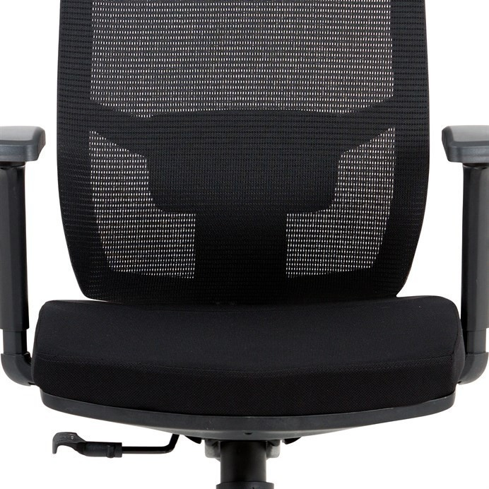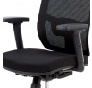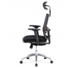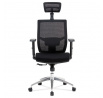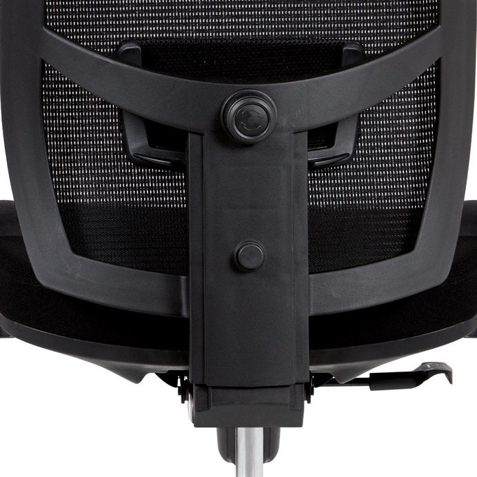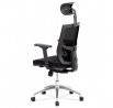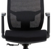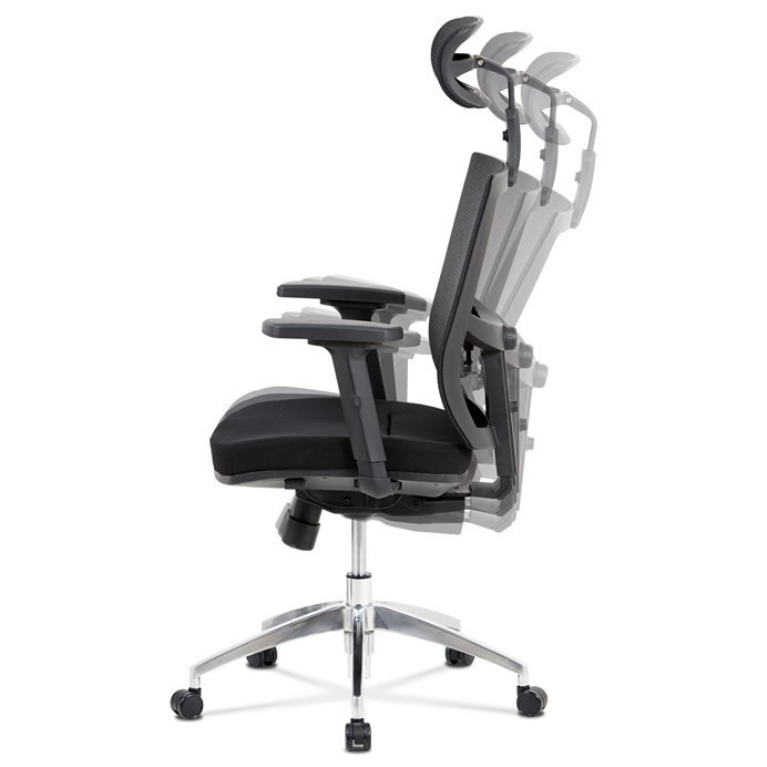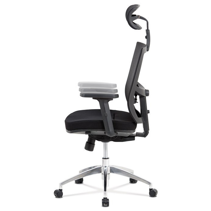 Kancelárska stolička s operadlom z čiernej sieťoviny MESH a sedadlom z čiernej látky. Stolička je výškovo nastaviteľná, vybavená synchrónnym mechanizmom. Plastové podrúčky sú nastaviteľné a výškovo nastaviteľné (2D). Výškovo nastaviteľné je aj operadlo. Vďaka malej páčke môžete sedadlo polohovať nezávisle dopredu alebo dozadu. Sieťovina, výškovo nastaviteľná a polohovateľná opierka hlavy a nastaviteľná bedrová opierka. Leštený hliníkový kríž s pogumovanými kolieskami vhodný na tvrdé podlahy.