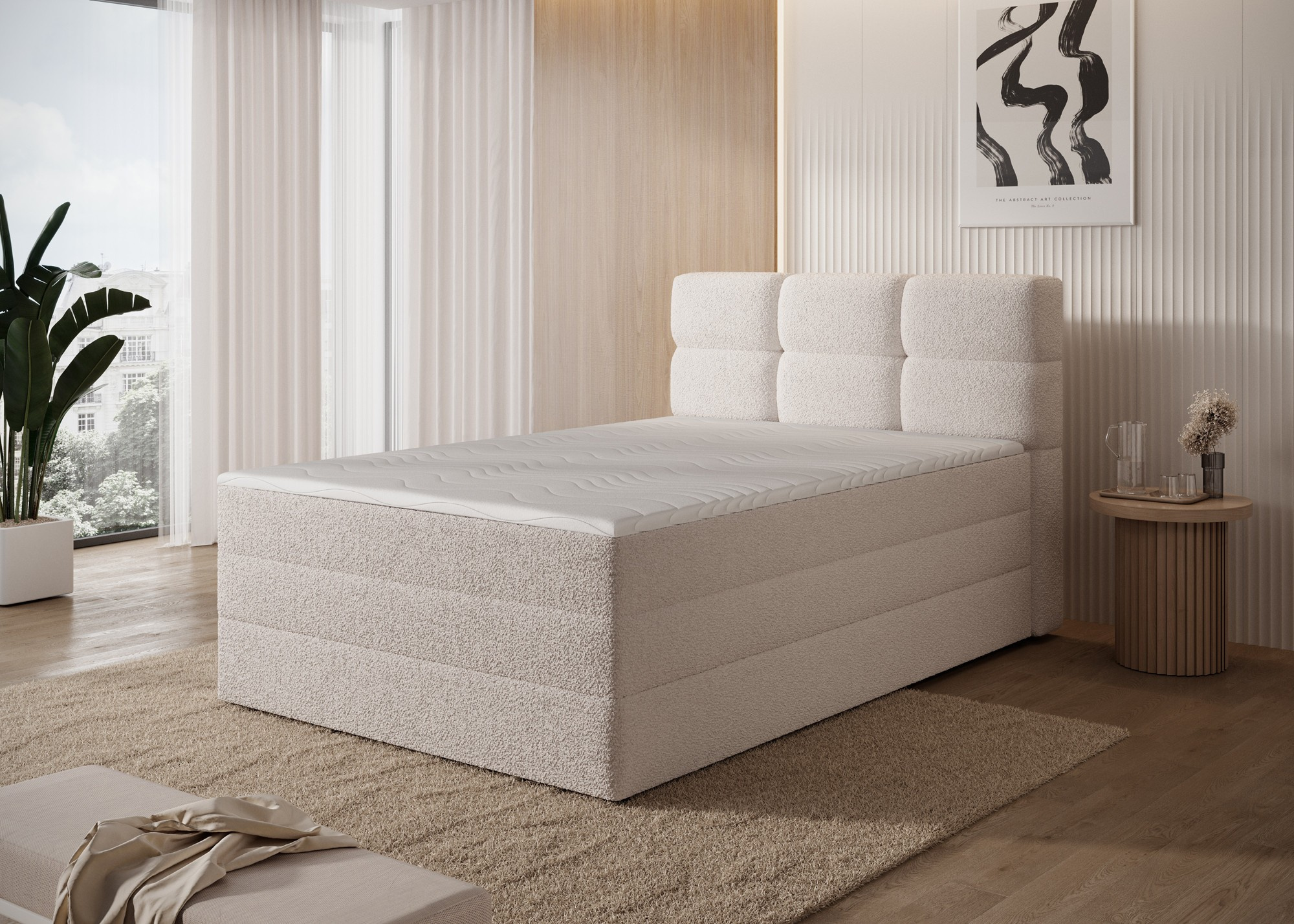 Kontinentálna posteľ Kasped je modernou a funkčnou voľbou pre každú spálňu, dostupná v dvoch veľkostiach: 215x121x108 cm a 215x141x108 cm, čo umožňuje ľahké prispôsobenie individuálnym potrebám a rozmerom miestnosti. Konštrukcia postele je založená na pevnom ráme vyrobenom z masívneho dreva a drevotriesky, čo zaisťuje dlhodobú stabilitu a odolnosť. V srdci dizajnu sa nachádza bonellová pružinová matrac, trvalo pripevnená k rámu, ktorá poskytuje spoľahlivú oporu tela a podporuje správnu cirkuláciu vzduchu pre zdravý a ergonomický spánok. Navyše posteľ obsahuje dve vrstvy vysoko kvalitnej peny – penu T2130 a penu T2540 – ktoré v kombinácii s bonellovou pružinovou jednotkou zvyšujú flexibilitu, pohodlie a prispôsobenie sa kontúram tela, čo podporuje pokojný a regeneračný spánok. Celá štruktúra je definovaná čistými líniami a modernou estetikou, doplnená čiernymi nohami nábytku z odolného plastu, ktoré pridávajú vizuálnu ľahkosť a zároveň zabezpečujú konštrukčnú integritu. Vysoko praktickou funkciou je vstavaný úložný priestor na posteľnú bielizeň, ktorý poskytuje pohodlné miesto na uloženie prikrývok, vankúšov alebo iných textílií, čo pomáha udržať spálňu čistú a usporiadanú. Posteľ Kasped kombinuje prvotriedne remeselné spracovanie, moderný dizajn a každodennú funkčnosť, čo z nej robí ideálnu voľbu ako pre moderné, tak aj pre klasickejšie interiérové usporiadania.