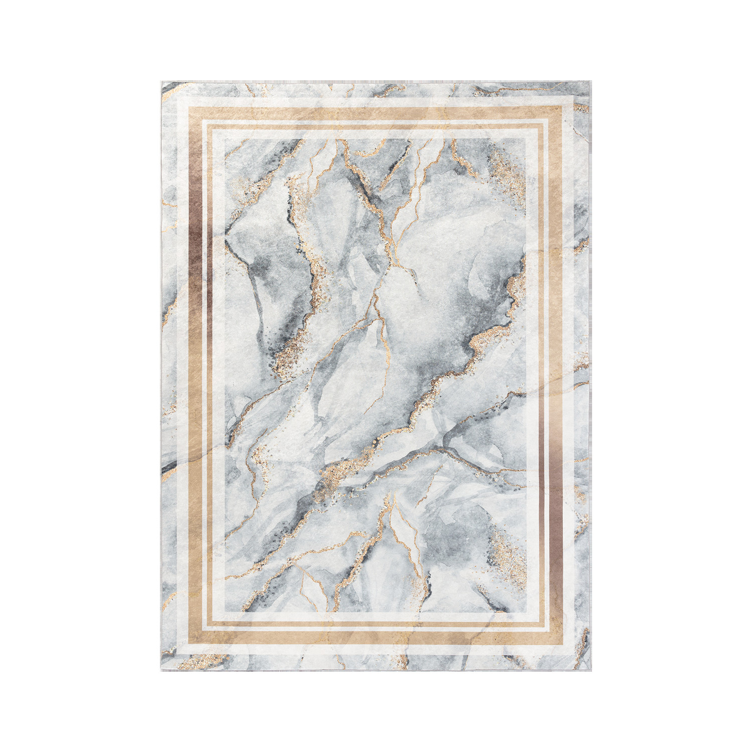 Koberec Squitta Grey Gold je luxusný návrh. Povrch potlačený vzorom štylizovaným ako vzácny mramor je kombinovaný so zlatým rámom. To robí tento produkt senzačnou voľbou pre interiéry vyzdobené s vkusom, kde sa vkusný pôvab stretáva s eleganciou. Polyesterový vlas a jutová spodná strana koberca zabezpečujú, že model nestratí svoju krásu príliš rýchlo, chráni ho pred poškodením, strapkaním a nečistotami.
