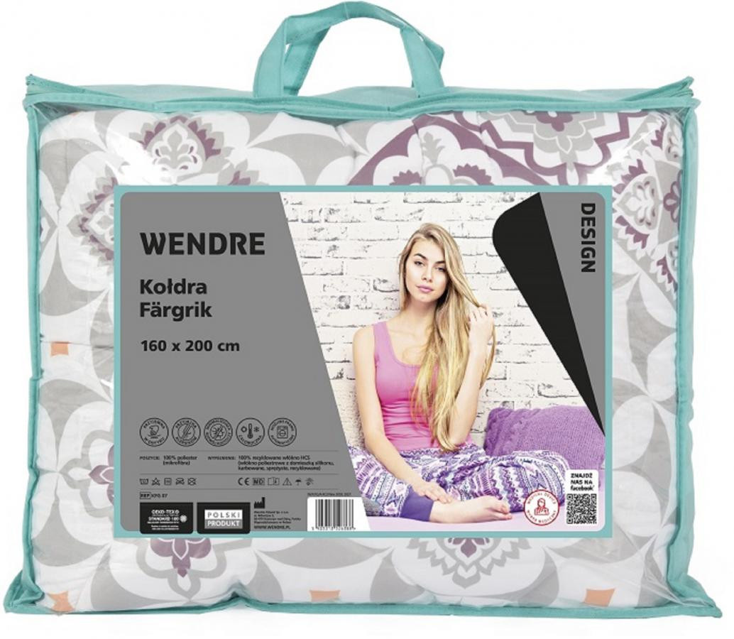 Wendre Färgik Marocco Quilt 160x200 Túto sezónu ponúkame jemný geometrický vzor v pastelových farbách. Ste pripravení na zmenu? Pestrá geometrická potlač na prikrývke a vankúšoch FÄRGRIK dodá vašej spálni ľahkosť a dokonale zapadne do moderných, minimalistických aj klasických interiérov. Vzor sa hodí nielen k svetlým farbám interiéru, ale aj k farebným stenám alebo nábytku. Obojstranné periny FÄRGRIK sú na jednej strane potlačené originálnym vzorom a na druhej strane sú hladké. Výber strany prikrývky závisí len od našej nálady. Prikrývky a vankúše s potlačou sú vyplnené polyesterovými vláknami HCS, vďaka ktorým sú výrobky mimoriadne mäkké a pružné. Škrupina - 100% polyester (potlačené mikrovlákno) Výplň - 100% recyklované guľôčky HCS, 1100 g Balenie - vrecko na zips + návod na použitie + vložka Pranie - 60 stupňov