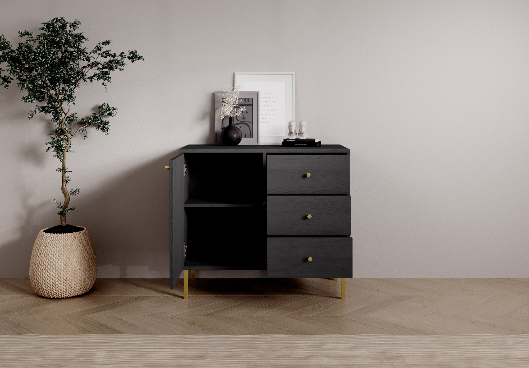 Komoda System Tili je moderný nábytok, ktorý sa vďaka svojej premyslenej farebnosti a elegantnému dizajnu dokonale hodí do rôznorodých interiérov. Dostupná v troch farebných variantoch: **čierna**, **piesková béžová** a **eukalyptus**, komoda predstavuje harmonické spojenie funkčnosti a estetiky. Každá farebná varianta bola starostlivo navrhnutá, aby zdôraznila jedinečný charakter interiéru. **Čierna** dodáva komode sofistikovaný, moderný vzhľad, ideálny pre minimalistické a elegantné priestory. **Piesková béžová** prináša teplo a jemnosť, dokonale sa hodí k svetlým, prírodným prvkom interiéru. Zatiaľ čo **eukalyptus** je odtieň inšpirovaný prírodou, ktorý prináša do interiéru sviežosť a ľahkosť, ideálny pre moderné aj viac klasické aranžmány.