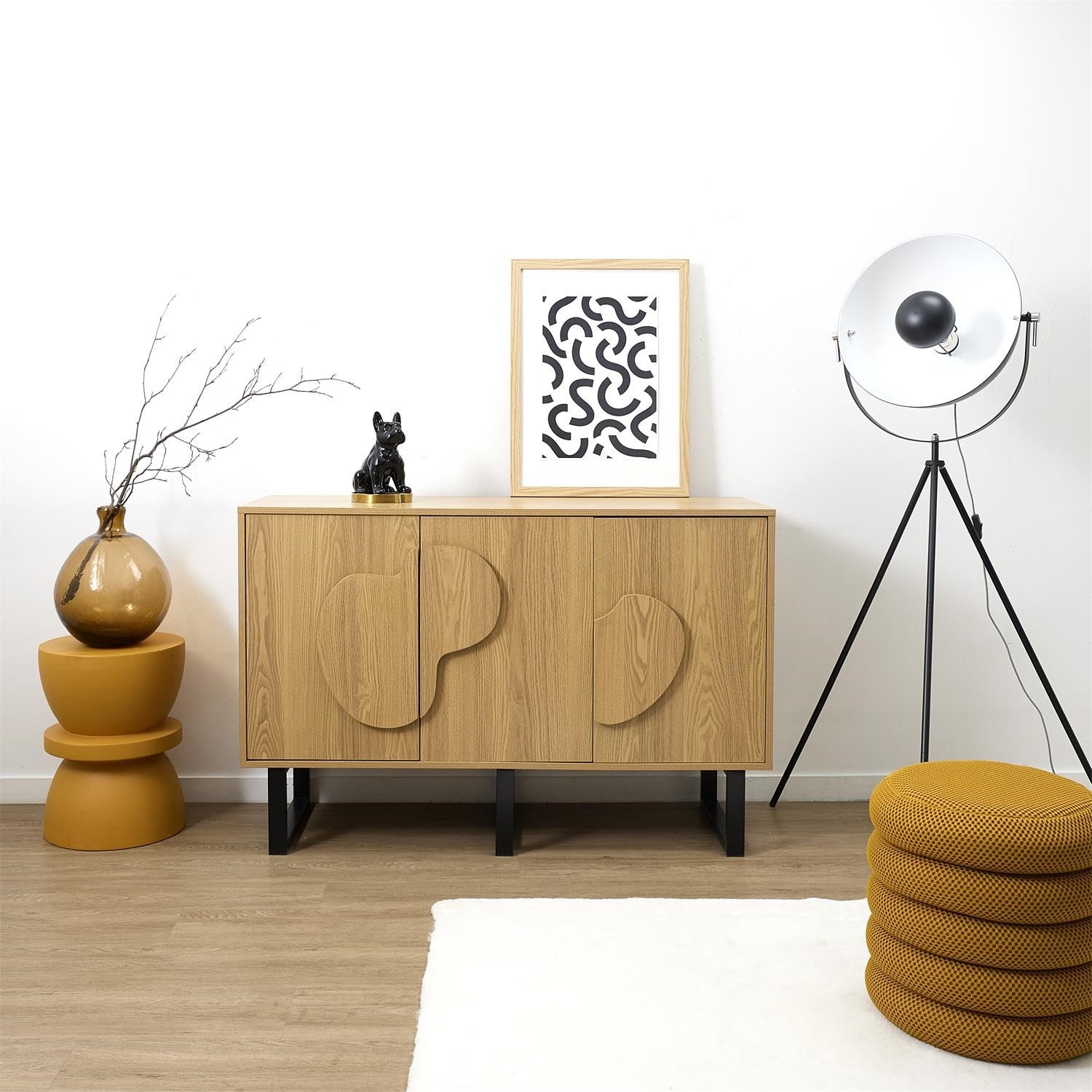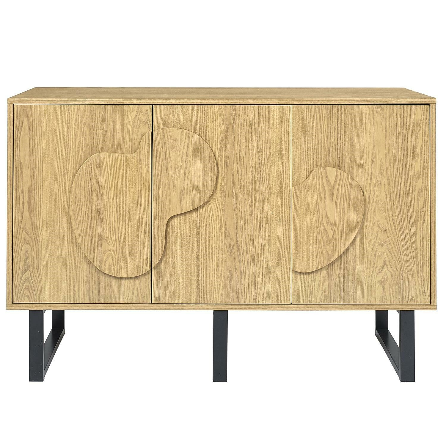 Komoda s 3 čelami Calypso je kombináciou dizajnu a kvality. Skrinka bola vyrobená z MDF dosky s dyhou imitujúcou dub. Čelá skrinky vyrobené tiež z odolnej MDF dosky, ozdobené dyhou imitujúcou letokruhy a štruktúru dreva. Skrinky nemajú tiché dovieranie. Tri čelá skriniek skrývajú za sebou policu. Priestranná komoda v štýle boho ozdobí každú obývačku, v ktorej dominujú prírodné farby a textúry. Úchyty skriniek majú vypuklý nepravidelný tvar, ktorý odkazuje na štýl japandi. Základom skrinky sú nohy v tvare lyžín. Nohy boli vyrobené z kovu lakovaného práškovou farbou. Skrinka vyžaduje montáž. Max. zaťaženie 40 kg. Hmotnosť skrinky 33,6 kg. Rozmery kartónu: 48,5x15,5x127 cm