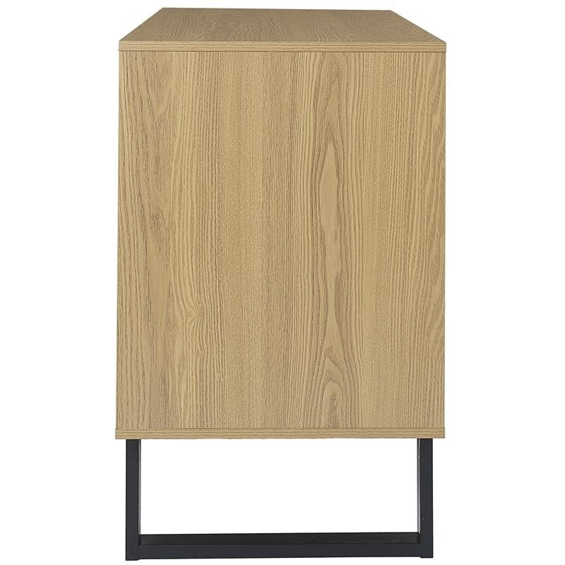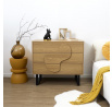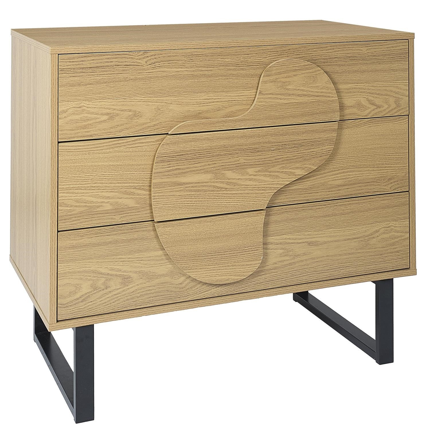 Komoda s 3 zásuvkami Calypso je kombináciou dizajnu a kvality. Skrinka bola vyrobená z MDF dosky s dyhou imitujúcou dub. Čelá skrinky sú tiež vyrobené z odolnej MDF dosky, ozdobené dyhou imitujúcou letokruhy a štruktúru dreva. Zásuvky na kovových, guľôčkových pojazdoch sa otvárajú ľahko, vďaka čomu budú ideálne pre každodenné používanie napr. ako komoda na prádlo alebo tričká. Tri čelá skrinky skrývajú za sebou množstvo úložného priestoru. Priestranná komoda v štýle boho ozdobí každú obývačku, v ktorej dominujú prírodné farby a textúry. Úchyty skriniek majú vypuklý nepravidelný tvar, ktorý odkazuje na štýl japandi. Základom skrinky sú nohy v tvare lyžín. Nohy boli vyrobené z kovu lakovaného práškovou farbou. Skrinka vyžaduje montáž. Max. zaťaženie 40 kg. Hmotnosť skrinky 30 kg. Rozmery kartónu: 14x54x104 cm