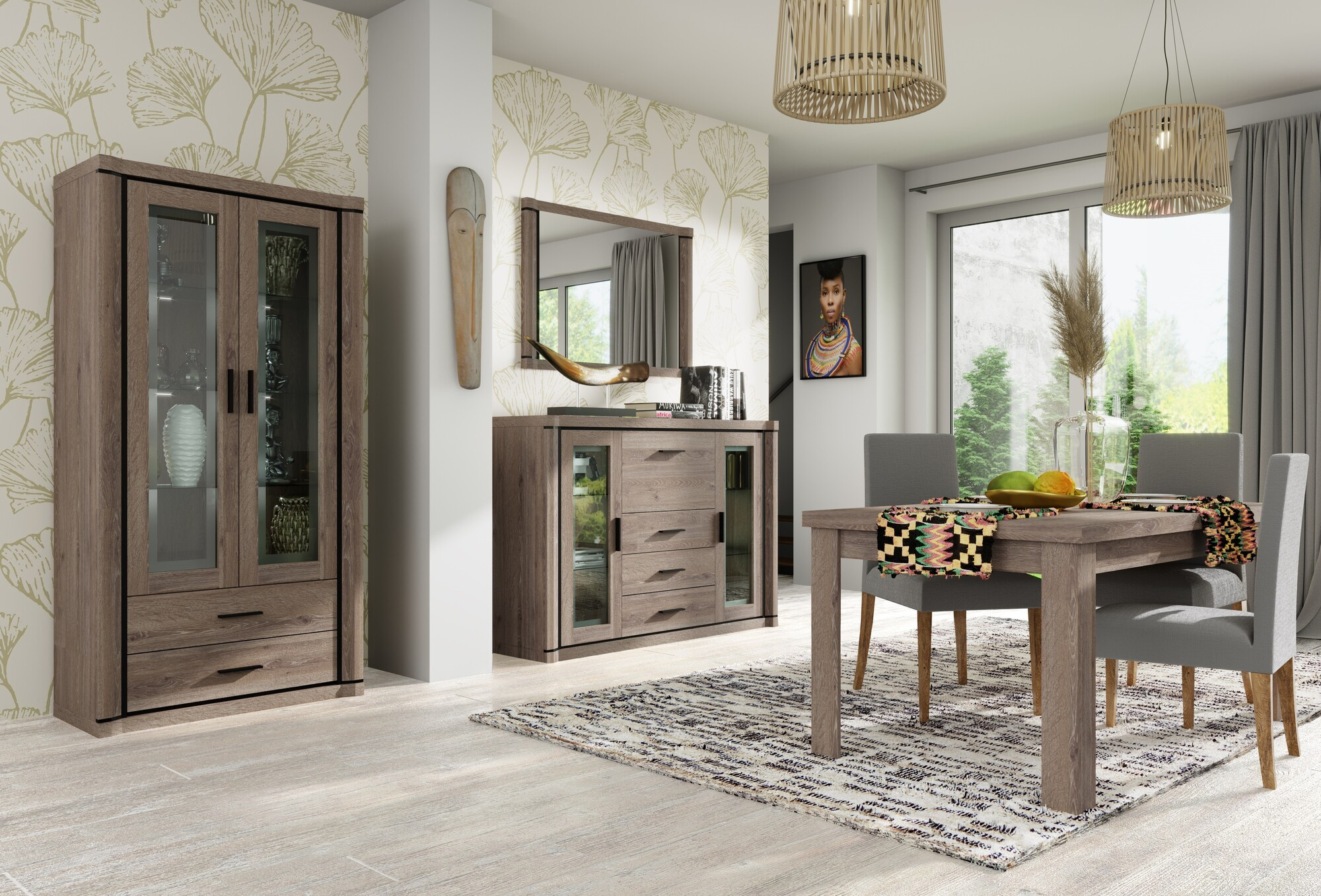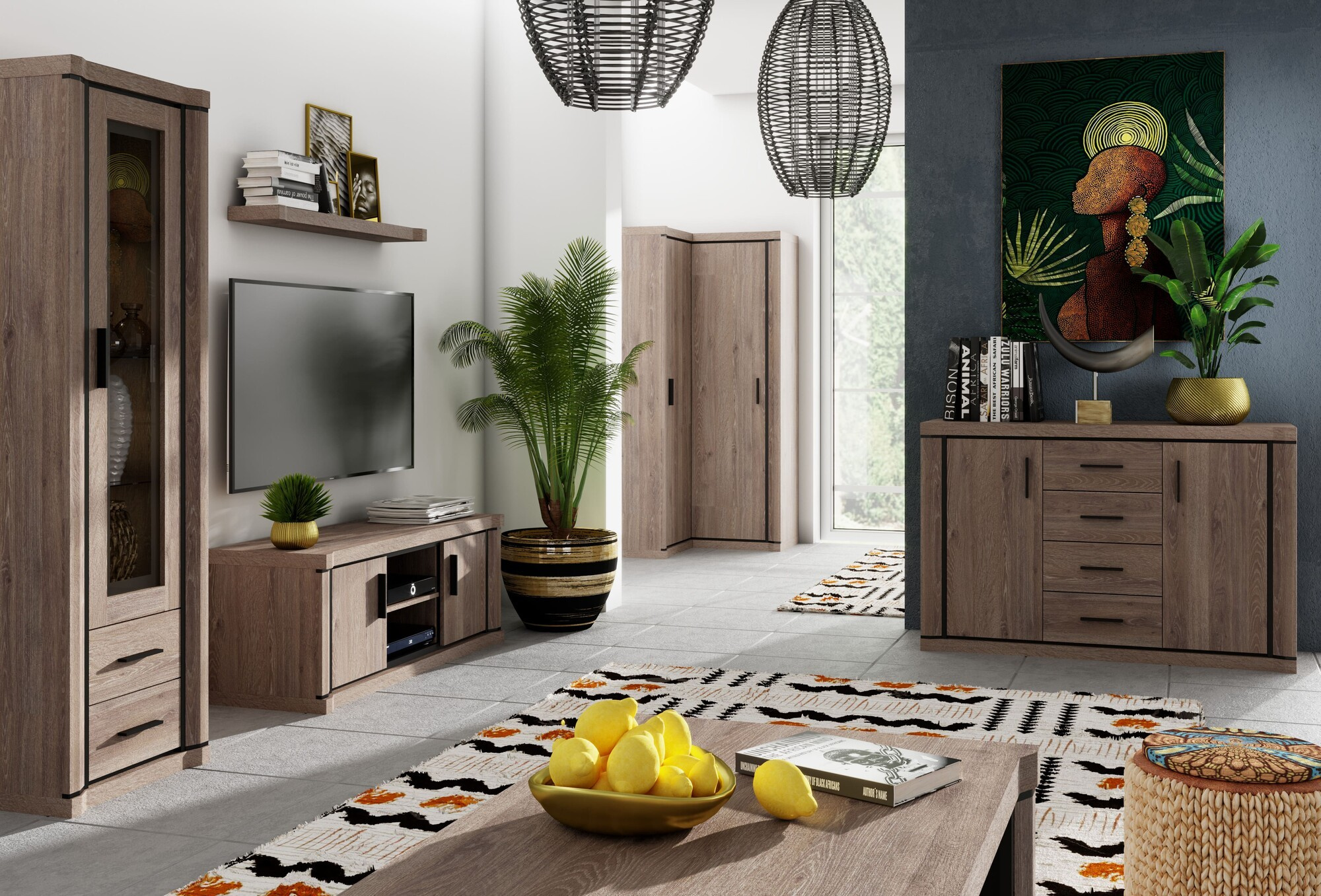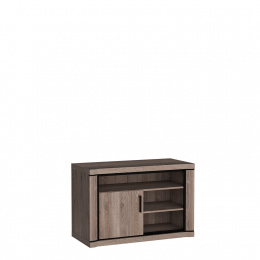Krásna RTV skrinka v tvare kocky, ktorá dokonale zapadá do trendov. Vďaka svojmu neobyčajnému vzhľadu a vysokej funkčnosti sa bude medzi vašimi blízkymi dokonale vynímať a navodí príjemnú atmosféru. Nábytok je vybavený tromi policami, dvoma menšími a jednou väčšou, z ktorých jedna je zakrytá skrinkou. Ideálne miesto pre všetky drobnosti, doplnky alebo užitočné predmety. Nezabudnime ani na dosku stola, na ktorej sa budú skvele vynímať ozdoby a suveníry. Kovové úchytky a okraje na čelách z neho robia úchvatné aranžmán. Dostupné v dvoch farbách.