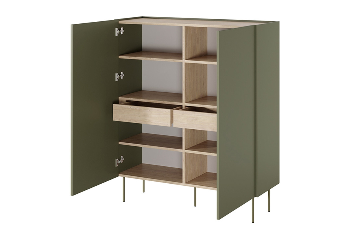 skriňa s dvomi dvierkami a dvoma zásuvkami Desin 120 2D2SZ - Oliva / Dub nagano, šírka: 120, výška: 140, hĺbka: 40, montáž: svojpomocne. Truhlica RTV na čiernych kovových nohách.