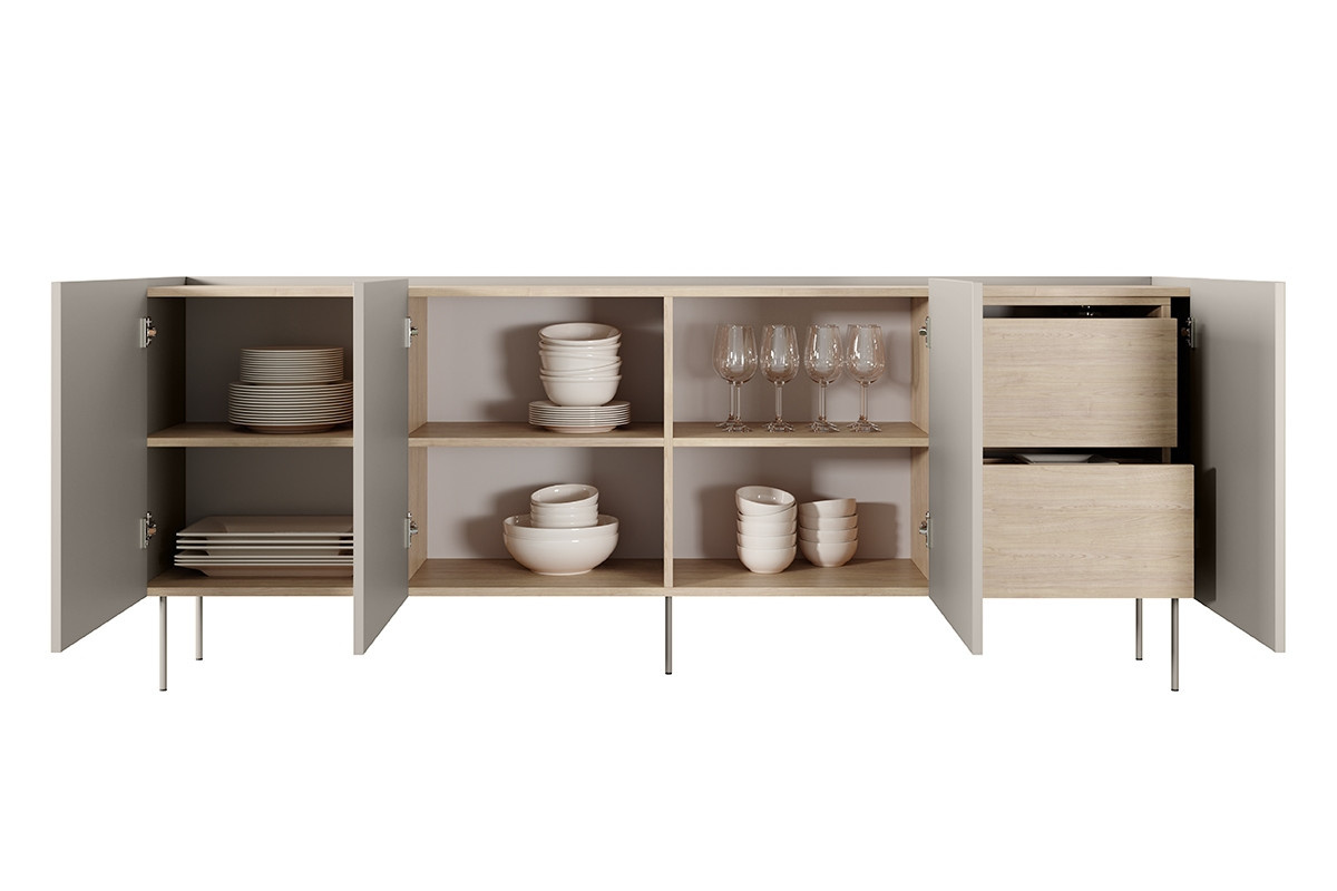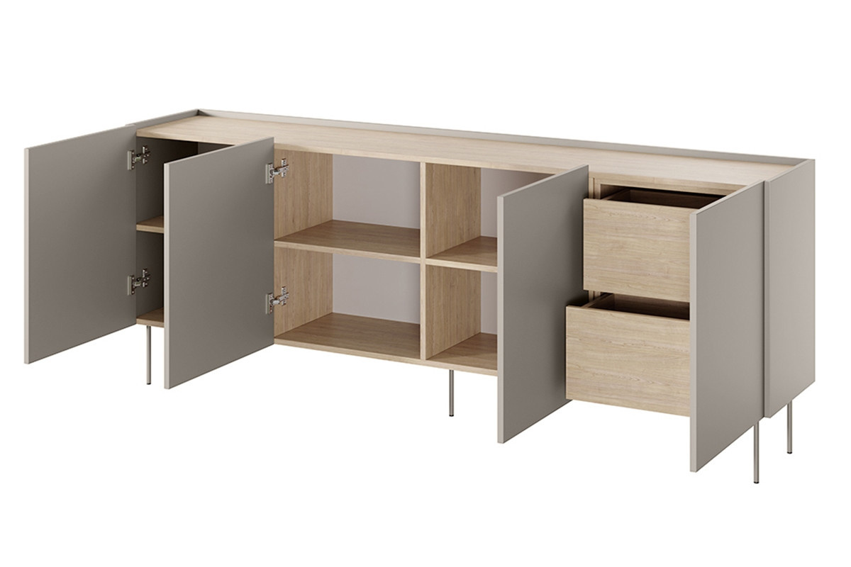 Štvordverová komoda s kontajnerom Desin 220 4D2SZ - kašmír / dub nagano, šírka: 220, výška: 85, hĺbka: 40, montáž: svojpomocne. Truhlica RTV na čiernych kovových nohách.