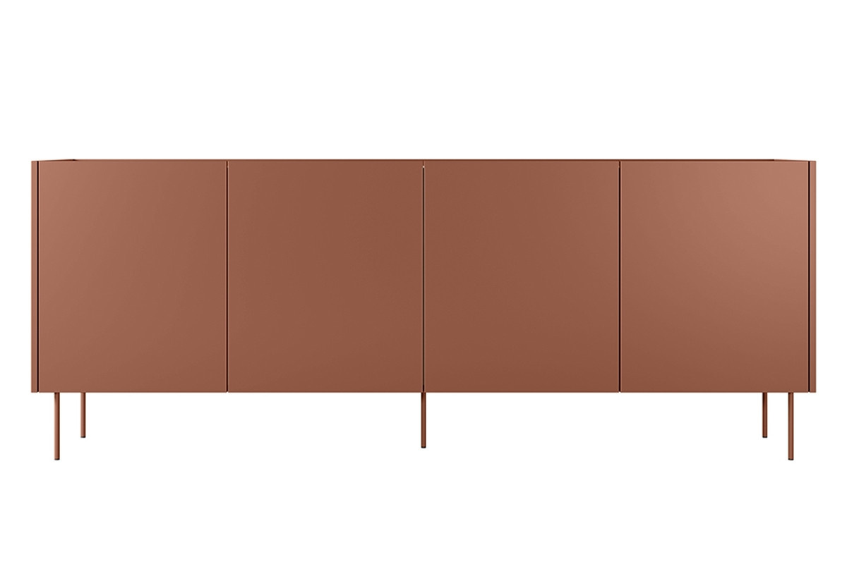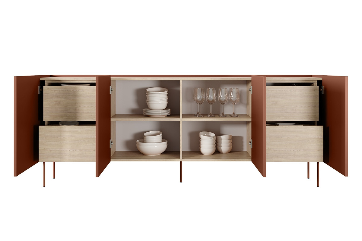 Komoda so štyrmi dvierkami Desin 220 4D4SZ - keramická červená / dub nagano, šírka: 220, výška: 85, hĺbka: 40, montáž: svojpomocne. Truhlica RTV na čiernych kovových nohách.