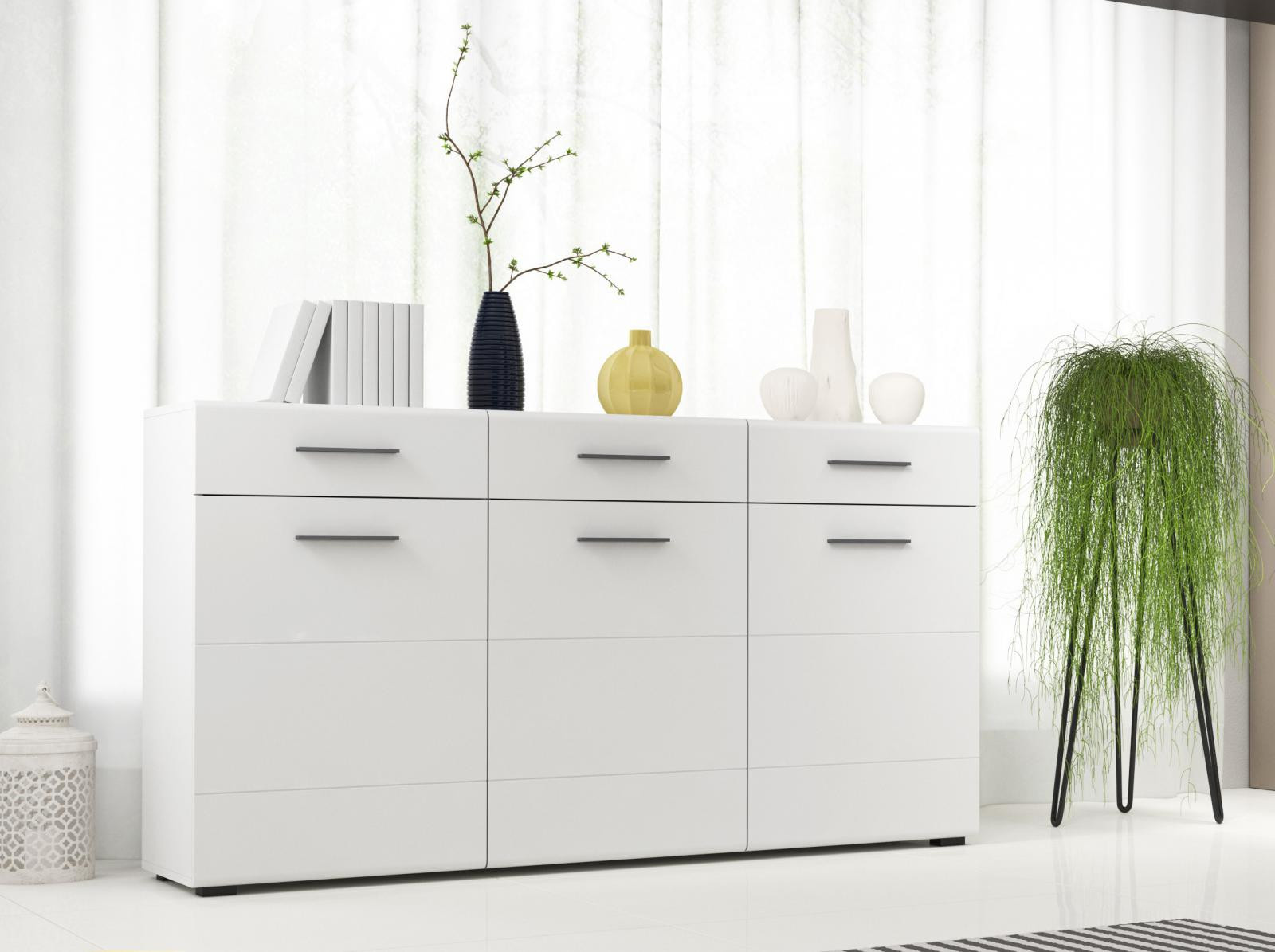 Komoda Elodie je skvelým doplnkom obývacej steny Elodie. môžete si ho kúpiť aj samostatne a doplniť ním svoj existujúci interiér. Komoda má všestranné využitie a ponúka dostatok úložného priestoru. Je vyrobená z bieleho laminátu, dvierka sú v bielom lesku. Komoda sa dodáva v demontovanom stave a obsahuje montážny plán vrátane všetkých potrebných spojovacích prvkov. Zobrazené príslušenstvo a dekorácie nie sú súčasťou balenia.