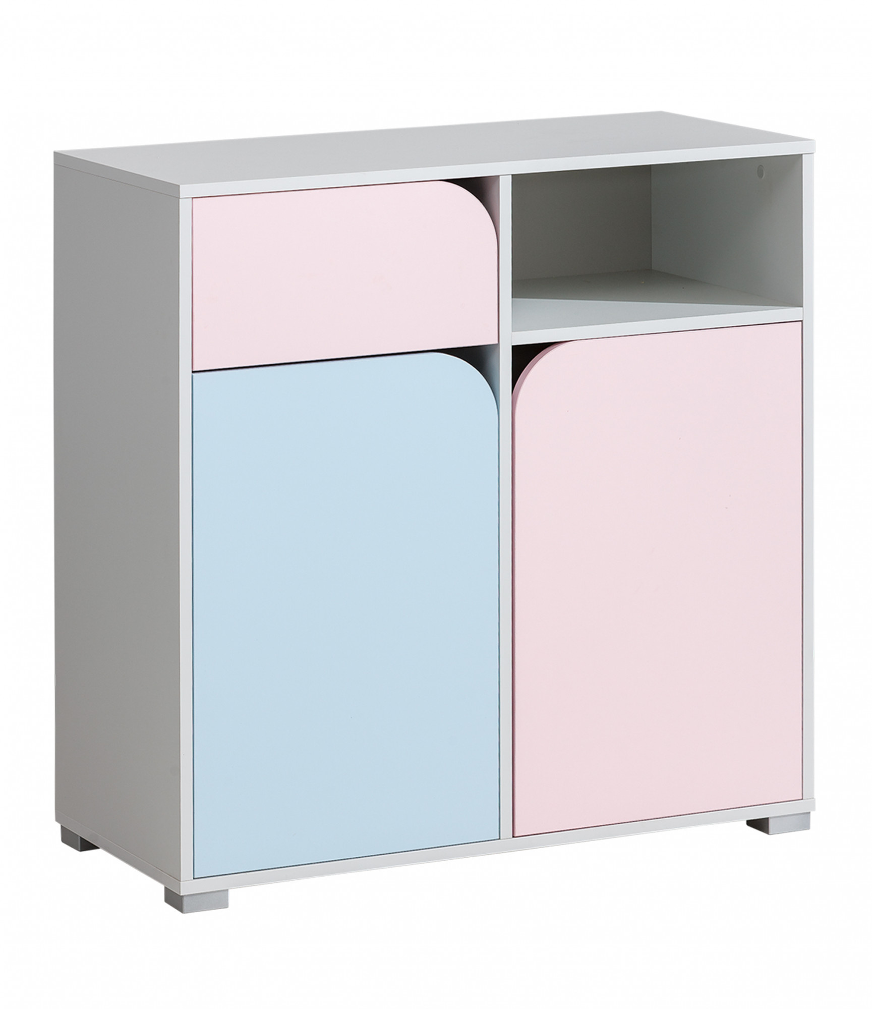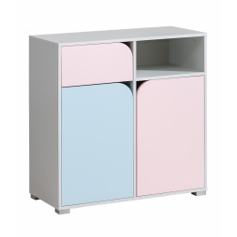 Komoda Mimo je k dispozícii v svetlosivej farbe v kombinácii s bledomodrou a ružovou.