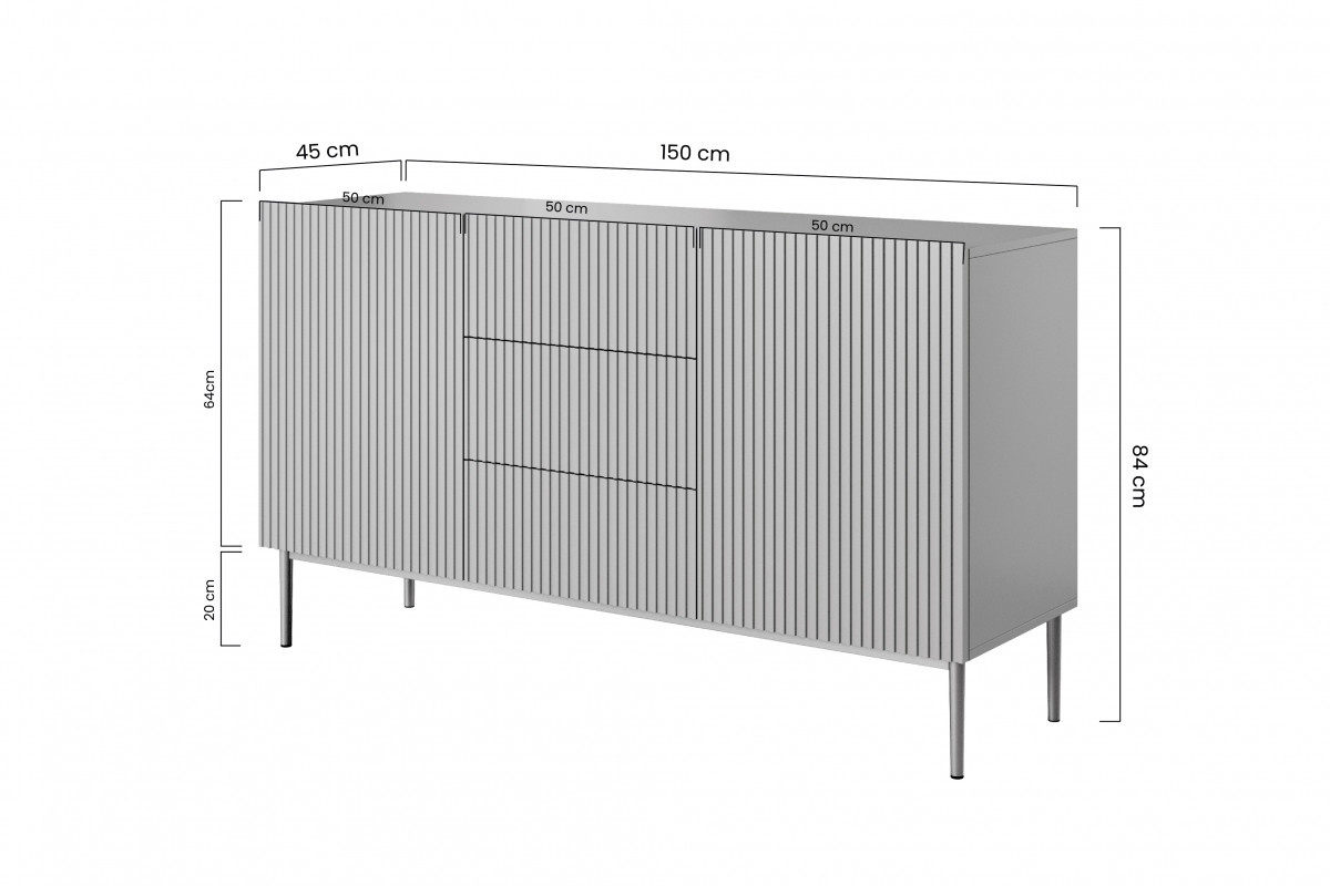 S rozmermi šírka 150 cm, výška 85 cm a hĺbka 45 cm je komoda dostatočne priestranná na uskladnenie všetkých vašich vecí, no zároveň kompaktná, aby sa zmestila aj do menších priestorov. Jej optimálna výška umožňuje pohodlné využitie vrchnej plochy na dekorácie, fotografie alebo iné osobné predmety.