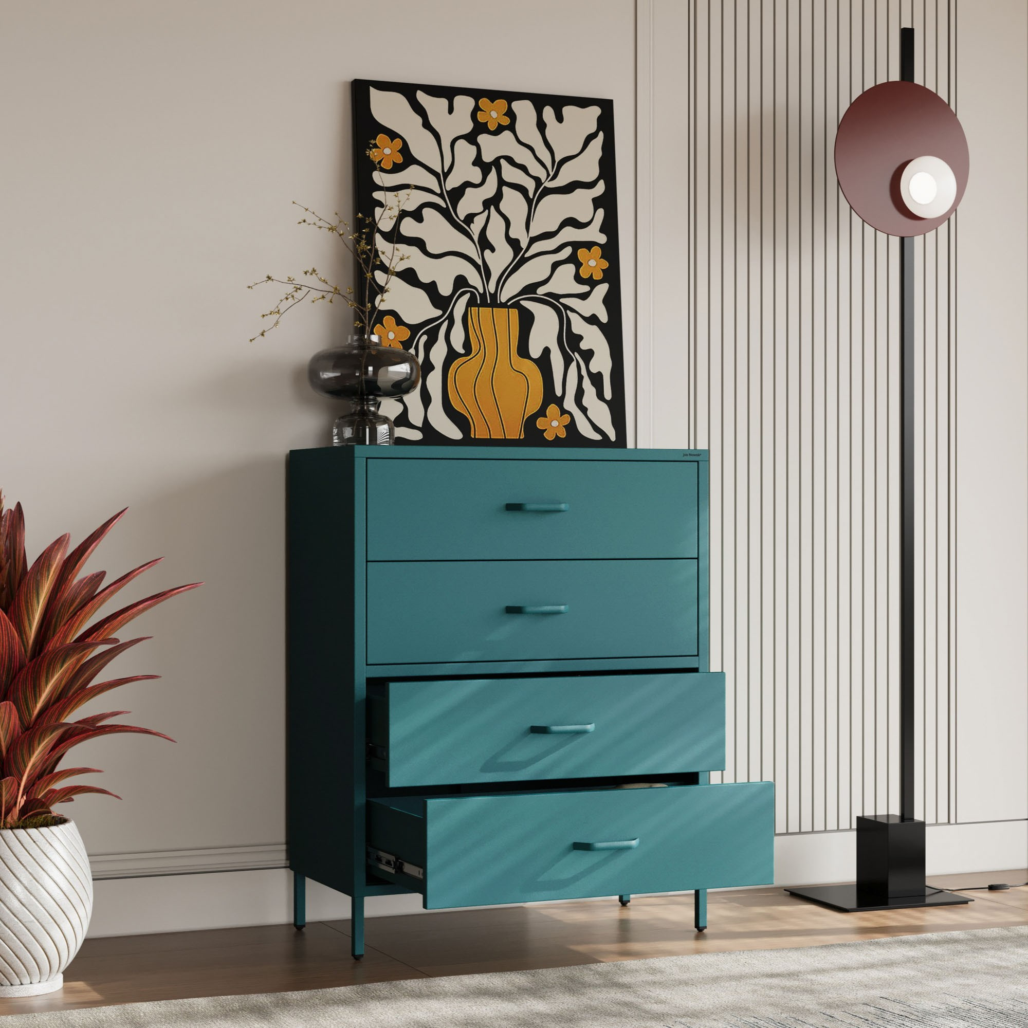 Potrebujete uložiť oblečenie, doplnky, dokumenty alebo iné predmety? Komoda CARLA ponúka štyri priestranné zásuvky, ktoré vám poskytnú dostatok úložného priestoru. Usporiadajte si svoje veci prehľadne a majte ich vždy po ruke.