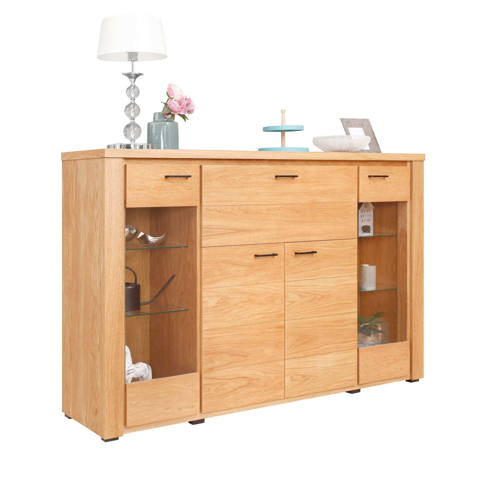 Komody, skrine, menšie skrinky a veľké vitríny. Špeciálne pre našich zákazníkov sme pripravili rozsiahly katalóg nábytku do obývacej izby, z ktorých každý prvok z kolekcie Natura sa vyznačuje vysokou kvalitou spracovania a atraktívnym, jedinečným dizajnom. \n \n \n \nŠpecifikácia: \n \n- Plastové nožičky - čierne, \n- Prírodná dubová dyha - olejovaná, \n- Kovové úchyty - čierne. \n \n* nábytok vyrábaný na zákazku - doba realizácie objednávky od 3 do 6 týždňov