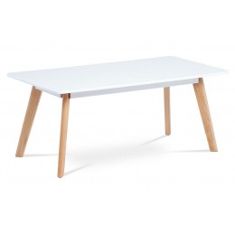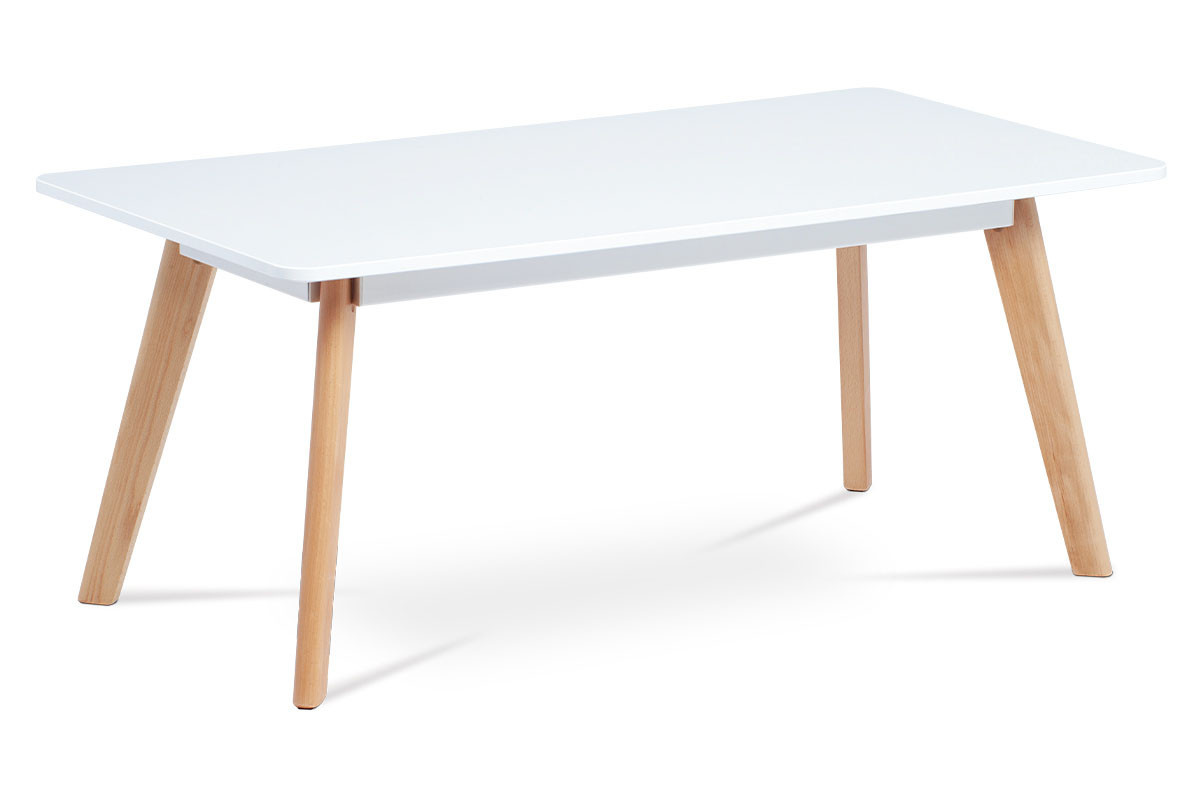 Moderný konferenčný stolík s vrchnou doskou z MDF, ktorá je natretá matnou bielou farbou a je vysoká 2 cm. Nohy z masívneho bukového dreva majú prírodný odtieň a sú vybavené penovými klzákmi.