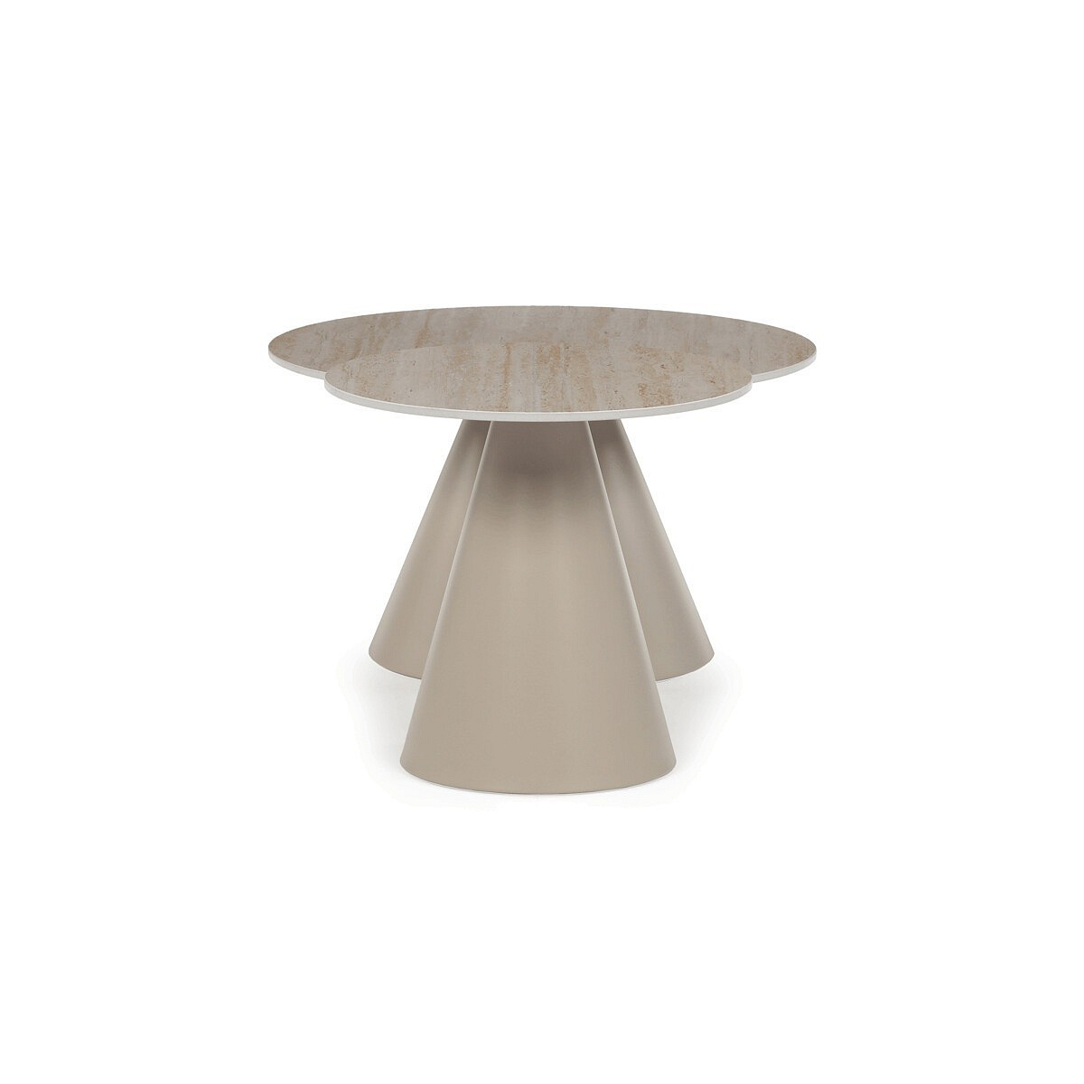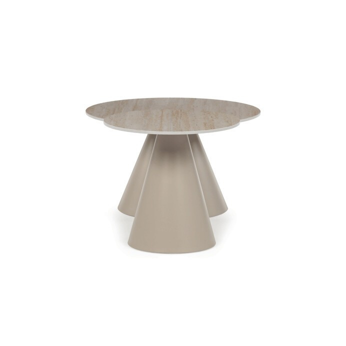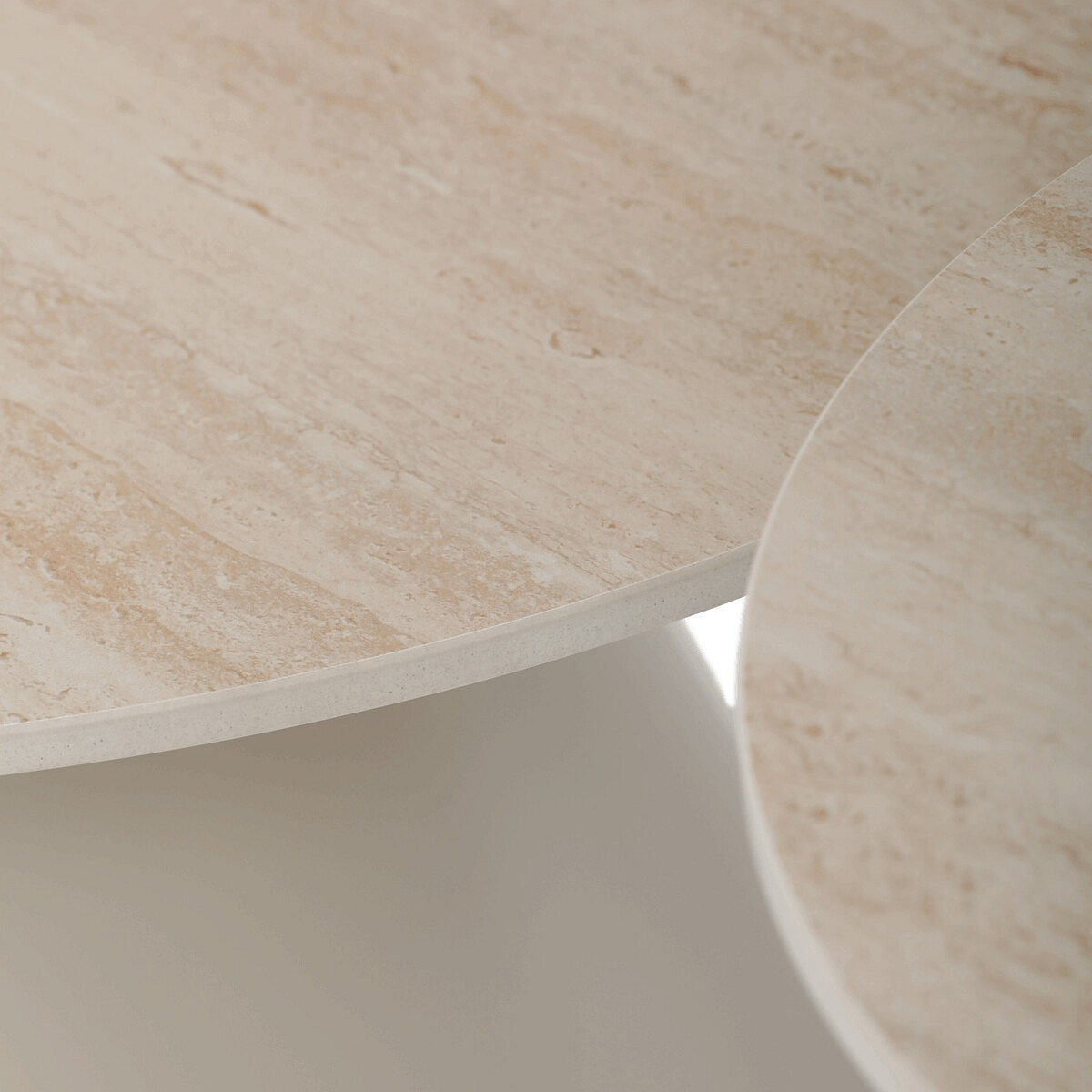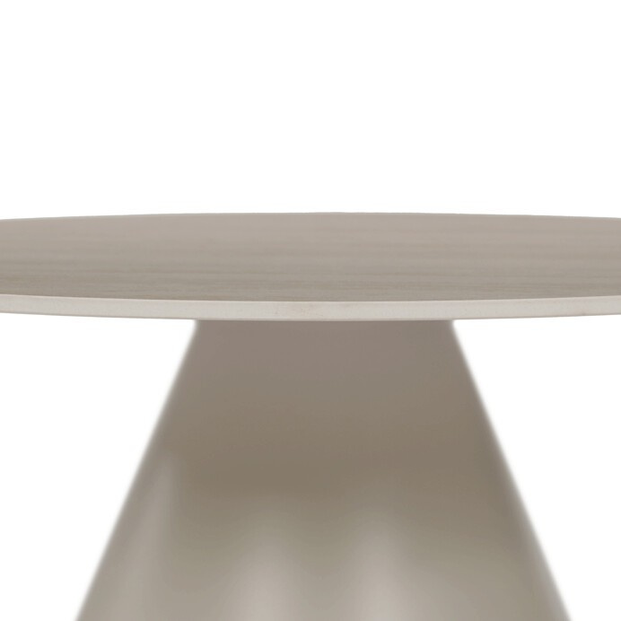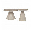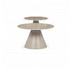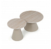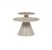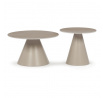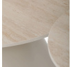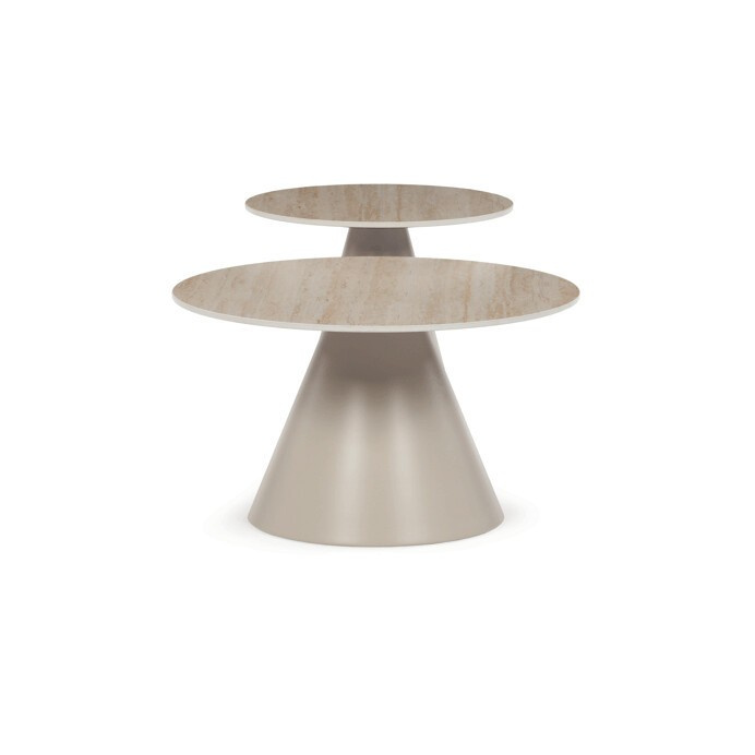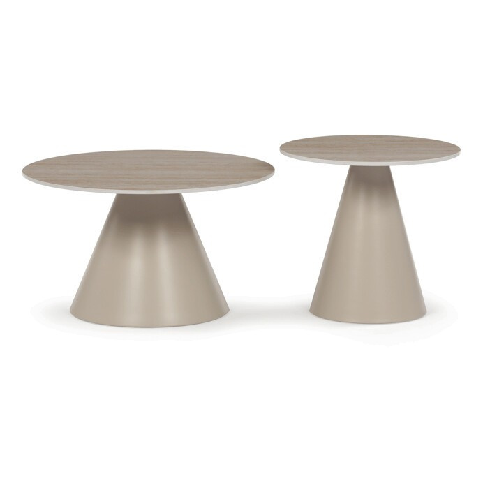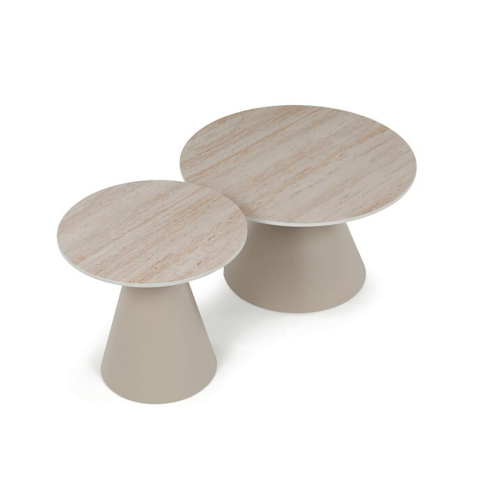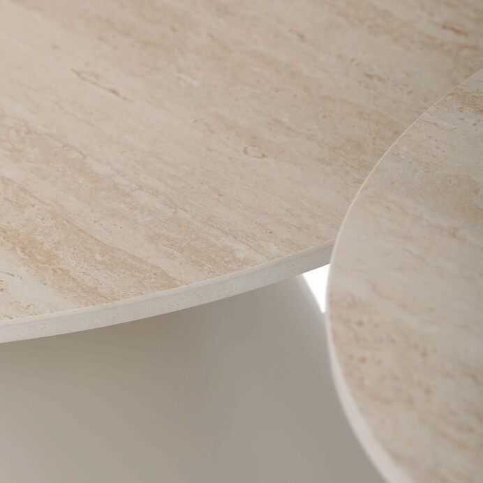 Sada konferenčních stolů v moderním stylu kombinuje keramické desky s dekorem travertinu a stabilní kovové podnože v béžovém matném provedení. Větší stůl má průměr 70 cm a výšku 40,5 cm, menší pak průměr 50 cm a výšku 47 cm, což umožňuje variabilní uspořádání v prostoru. Keramická deska je navržena pro snadnou údržbu a odolnost vůči běžnému opotřebení, zatímco pevná kovová podnož zajišťuje stabilitu a dlouhou životnost. Design stolů je minimalistický s jemnými přírodními odstíny, které přispívají k příjemné atmosféře v obývacím pokoji nebo kanceláři. Sada je ideální volbou pro ty, kdo hledají kombinaci funkčnosti a decentního designu.