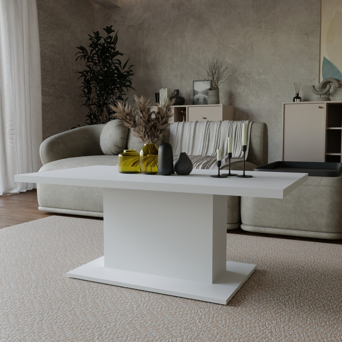 Konferenčný stolík Denis je atraktívny stôl z laminátu vo veľmi obľúbenej a modernej bielej farbe. Staška je dostatočne veľká na všetko, čo potrebujete odložiť. Hrnček kávy alebo čaju, tanier, kniha, telefón, notebook alebo dokonca unavené nohy po celodennom maratóne. Stôl sa dodáva v demontovanom stave. Balenie obsahuje montážny plán vrátane všetkých potrebných spojovacích prvkov.zobrazené príslušenstvo a dekorácie nie sú súčasťou balenia.