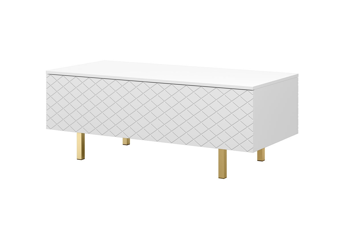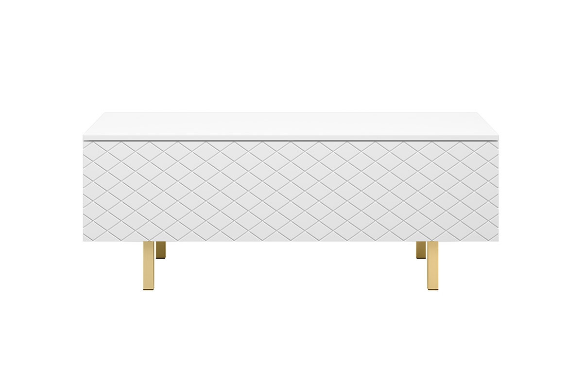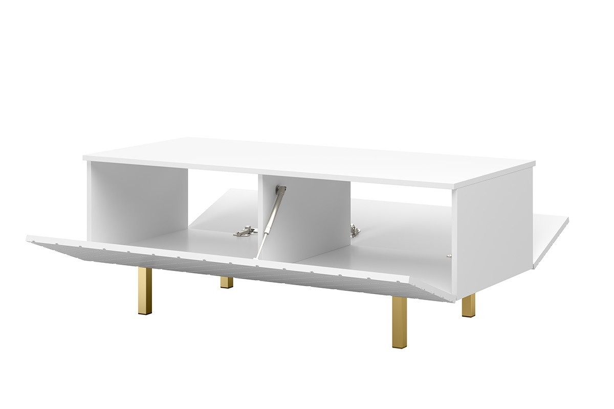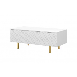 Konferenčný stolík Scalia II 120 2K od schowkiem - biely mat / zlaté nohy, šírka: 120, výška: 46, hĺbka: 55, montáž: vlastná. Truhlica RTV na čiernych kovových nohách.