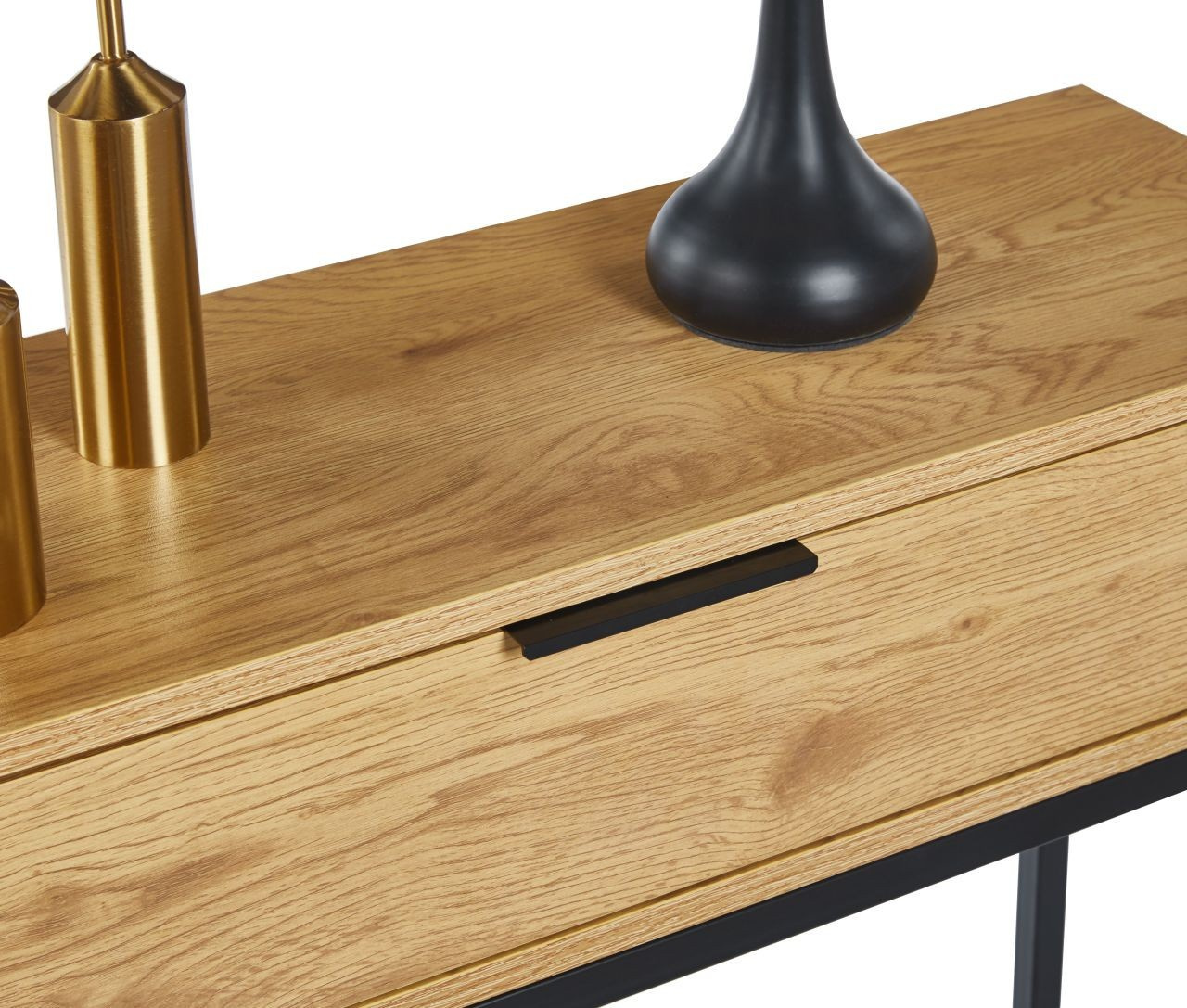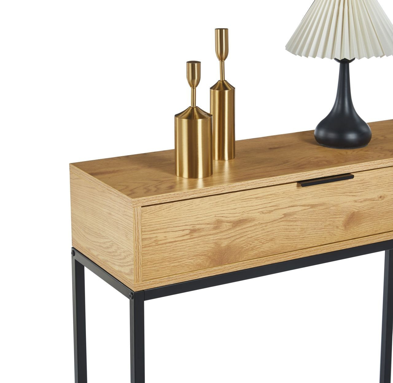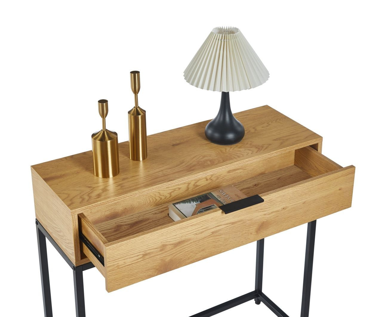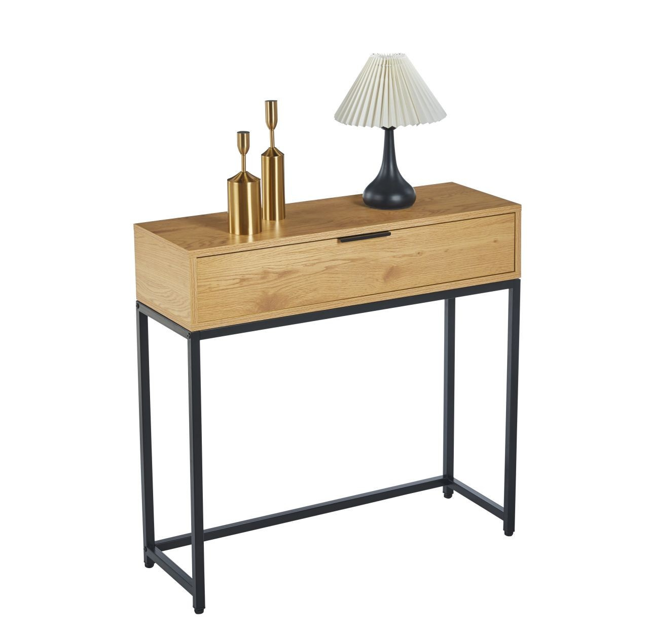 ROZMERY: - hĺbka: 28 cm - šírka: 80 cm - výška: 77 cm MATERIÁL: - laminovaná drevotrieska + práškovo lakovaný kov FARBA: - prírodný dub + čierna OSTATNÉ: - zásuvka