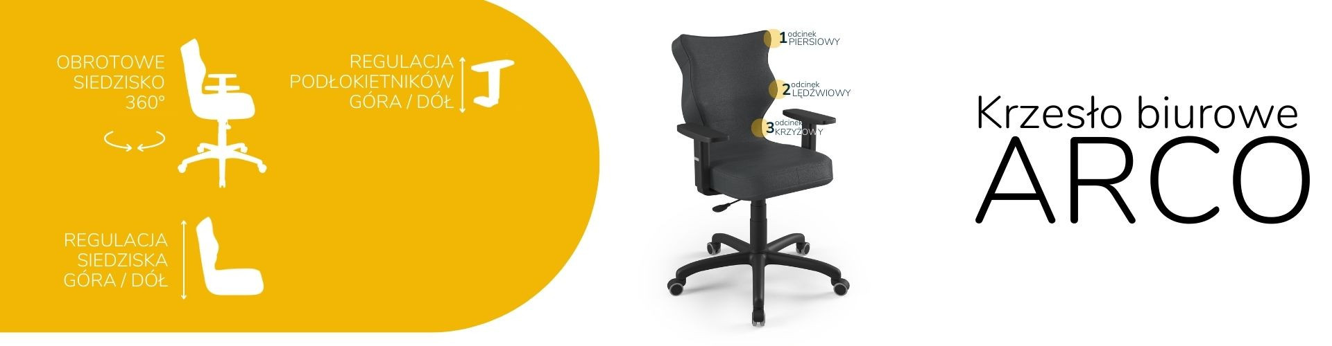 Židle Arco je ergonomická kancelářská židle, která byla navržena pro lidi pracující vsedě. Čalouněná kancelářská židle Arco je vybavena měkkým a pohodlným sedákem, který poskytuje dostatečné pohodlí osobám sedícím u stolu po mnoho hodin. Kancelářská židle Arco je navíc vybavena speciálně tvarovaným opěradlem, které zmírňuje namáhání páteře. Konstrukce a tvar opěradla jsou profilovány tak, aby nedocházelo k přetěžování páteře a aby se zabránilo vadám držení těla, jako je skolióza. Profilovaná kancelářská židle poskytuje nejen stabilní oporu zádům sedícího, ale také ovlivňuje správnou polohu zad. Měkké plastové sedadlo netlačí na nohy a je pohodlné i při několikahodinové práci v jedné poloze.