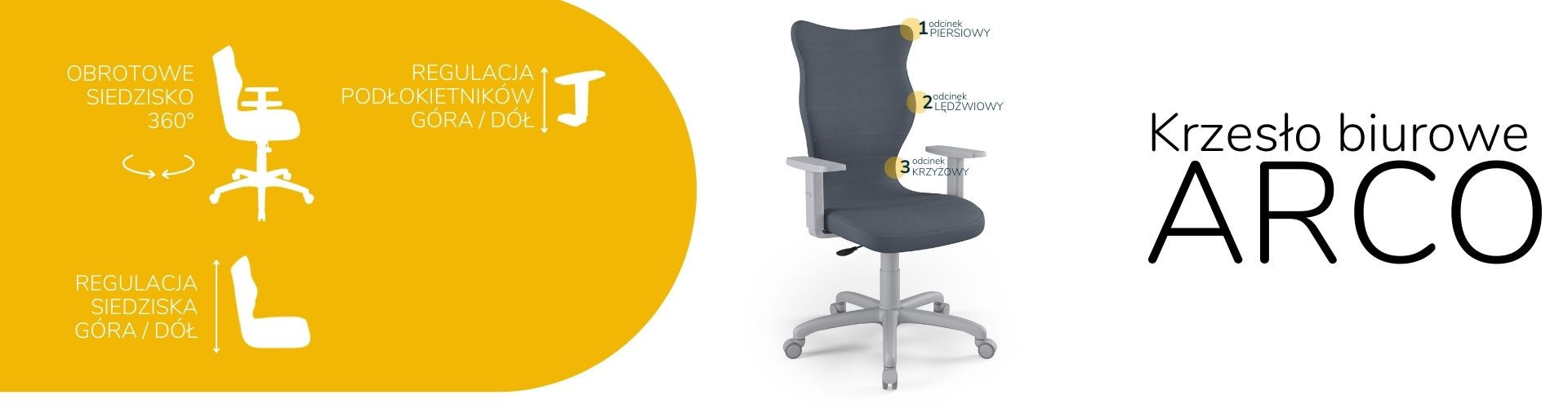 Stolička Arco je ergonomická kancelárska stolička, ktorá bola navrhnutá pre ľudí pracujúcich v sede. Čalúnená kancelárska stolička Arco je vybavená mäkkým a pohodlným sedákom, ktorý poskytuje dostatočné pohodlie osobám sediacim pri stole po mnoho hodín. Kancelárska stolička Arco je navyše vybavená špeciálne tvarovanou opierkou, ktorá zmierňuje namáhanie chrbtice. Konštrukcia a tvar operadla sú profilované tak, aby nedochádzalo k preťažovaniu chrbtice a aby sa zabránilo vadám držania tela, ako je skolióza. Profilovaná kancelárska stolička poskytuje nielen stabilnú oporu chrbtu sediaceho, ale tiež ovplyvňuje správnu polohu chrbta. Mäkké plastové sedadlo netlačí na nohy a je pohodlné aj pri niekoľkohodinovej práci v jednej polohe.