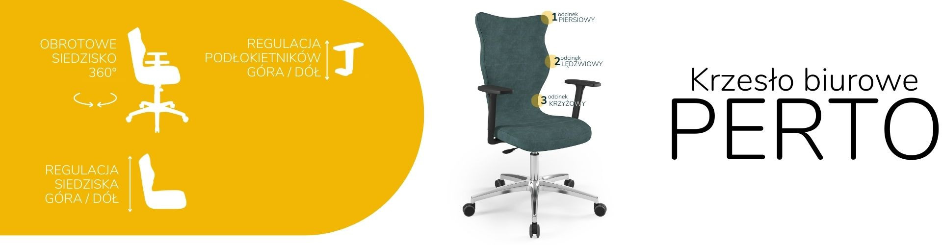 Moderná stolička Perto Black je praktické a elegantné riešenie prispôsobené potrebám modernej kancelárie. Pri dlhej práci v sede sú veľmi dôležité správne podmienky. Optimálne držanie tela je úplne zásadné, ale dôležité sú aj otázky, ako je vzdialenosť od monitora a časté zmeny polohy. Kancelárska stolička Perto s leštenou podnožou, ktorú ponúkame, vám umožní efektívne sa postarať o všetky tri aspekty naraz. Tým sa zvyšuje naša výkonnosť a výrazne sa znižujú negatívne účinky sedavého zamestnania. Kancelárska stolička na kolieskach tiež rieši organizačné problémy spojené s usporiadaním a zmenou usporiadania priestoru v kancelárii. Môžeme ich ľahko premiestniť alebo presunúť do nižšieho či vyššieho poschodia. Nebude nás to stáť príliš veľa úsilia, pretože nami navrhnutá leštená kancelárska stolička je veľmi ľahká.