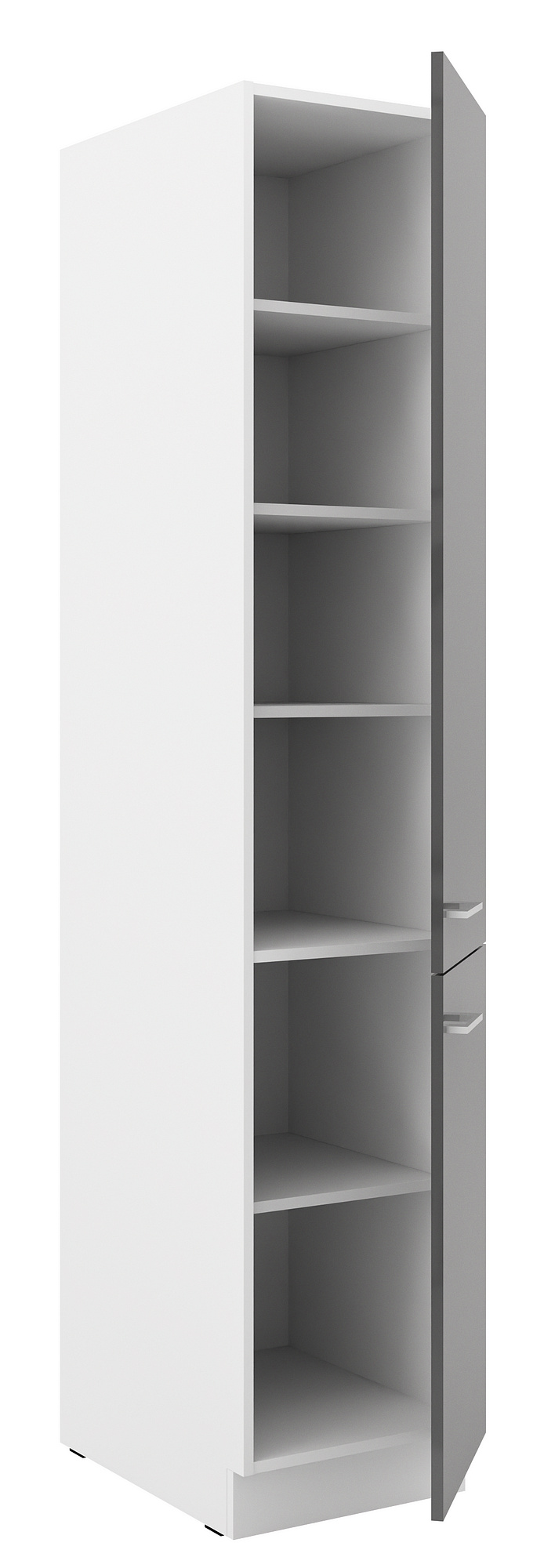 Dvierka a čelá zásuviek sú vyrobené z materiálu PUR HG v elegantnom sivom lesku, ktorý dodáva skrinke moderný vzhľad. ABS hrany zabezpečujú dlhú životnosť a odolnosť proti poškodeniu. Dvierka je možné namontovať ako pravé alebo ľavé, čo poskytuje flexibilitu pri inštalácii.