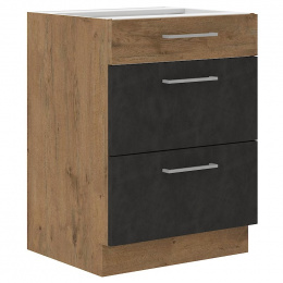 Spodná kuchynská skrinka je vyrobená z laminátu s hrúbkou 16 mm v matnej farbe. Korpus skrine je z dubového dreva lancelot. Táto skrinka sa skladá z jednej spodnej a dvoch vyšších zásuviek. Všetky s kovovými rukoväťami (dĺžka 192 mm). Skriňa je vyrobená z vysokokvalitných MDF dosiek. Dvere sú vybavené systémom tichého zatvárania . zostavte si modernú a dizajnovú kuchyňu podľa svojich predstáv z našej širokej ponuky skriniek. Na ďalších fotografiách nájdete fotografie kuchýň, ktoré sú zložené z týchto skriniek, aby ste sa mohli inšpirovať. Skriňa sa dodáva v demontovanom stave. Montážny plán vrátane všetkých potrebných spojovacích prvkov je súčasťou balenia.