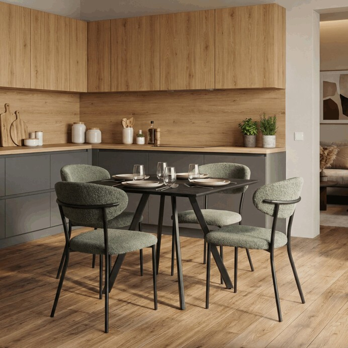 Jídelní stůl o rozměrech 90x90x76 cm nabízí kulatý tvar desky z MDF s matnou povrchovou úpravou v dekoru šedého dubu, která je zakončena ABS hranou pro zvýšenou odolnost proti poškození. Stabilní kovová podnož v černé barvě je tvořena čtyřmi nohami se zkoseným profilem, které jsou vybaveny rektifikačními patkami pro vyrovnání nerovností podlahy a zajištění pevné stability. Lamino deska je navržena tak, aby se snadno udržovala a odolávala běžnému opotřebení v domácím i komerčním prostředí. Díky svému designu a barevnému provedení stůl vhodně doplní moderní i industriální interiéry. Nosnost a další technické parametry jsou optimalizovány pro běžné použití v jídelnách a kuchyních.