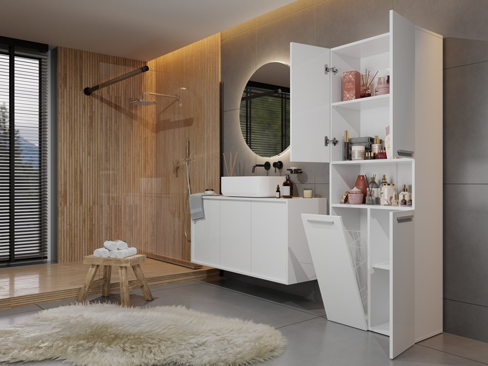 Štýlová skrinka Noeli vám pomôže vytvoriť dokonale usporiadanú a útulnú kúpeľňu vďaka praktickému úložnému priestoru. Nadčasový dizajn splní očakávania tých, ktorí ocenia kombináciu jednoduchosti a elegancie. Skrinka je vyrobená z laminátu, ktorý sa ľahko udržiava, hrany sú potiahnuté plastom ABS (vyznačuje sa vysokou mechanickou a chemickou odolnosťou).