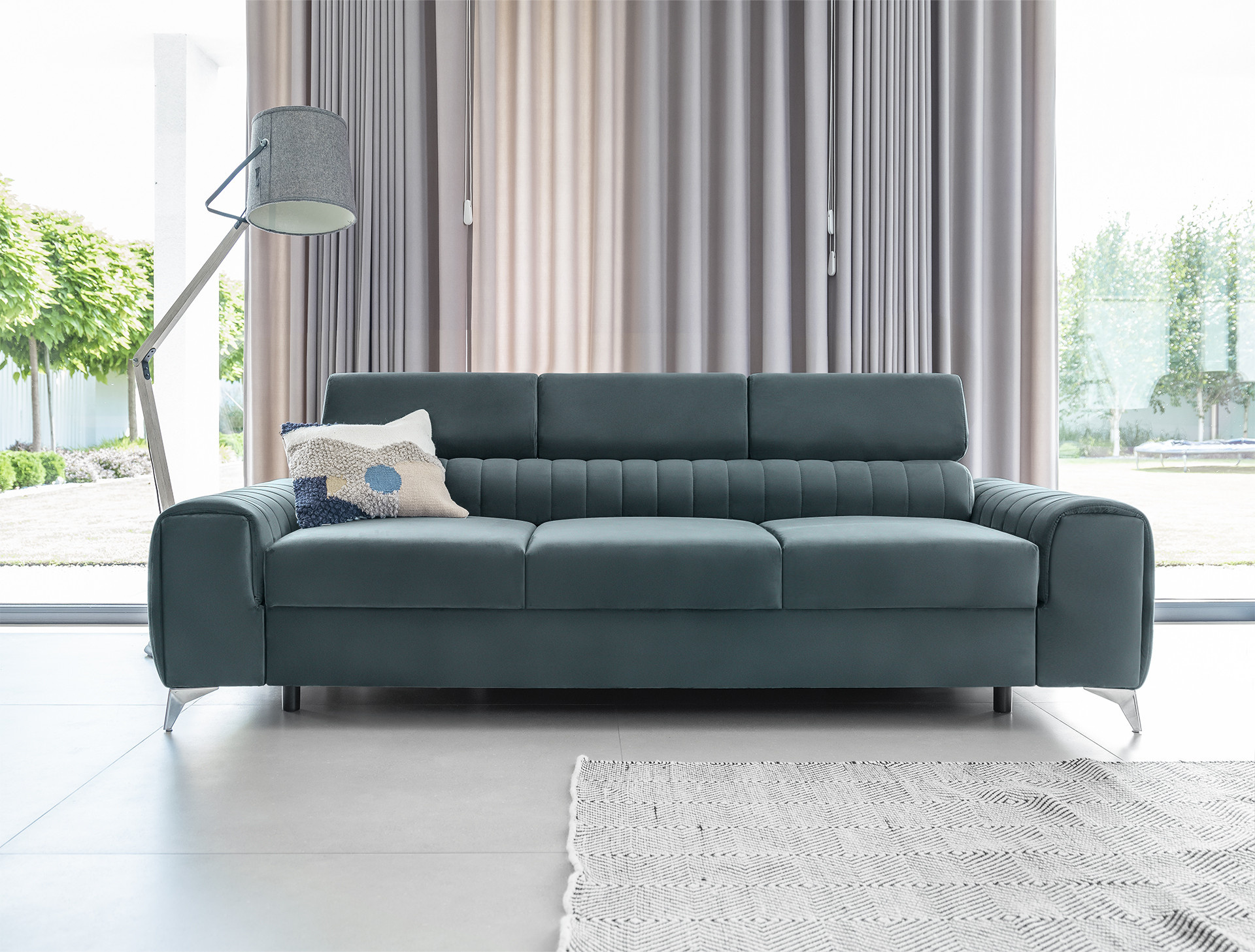 Pohovka Laurence má pevný drevený rám, ktorý spočíva na šikmých, chrómovaných kovových nohách. Táto rozkladacia pohovka, obalená v elegantných látkach z kolekcie ELTAP, má sedák vyplnený penami HR a T30. Okrem toho je kus nábytku podopretý pevnými vlnovými pružinami typu B, ktoré poskytujú pocit pohodlia a komfortu. Pohovka Laurence prináša ľahkosť a štýl do interiéru. Klasický tvar tohto kusu nábytku je v kontraste s prešívaním a jasne zdôrazneným rozdelením na tri sedacie plochy. Pohovka Laurence je ideálnou voľbou pre menšie miestnosti, kam napríklad nemôžete umiestniť rohovú sedaciu súpravu. Jeho rozmery sú: 260 x 97 x 75 centimetrov. Výška jeho nôh (10 cm) vám umožňuje čistiť podlahu pod gaučom pomocou moderných čistiacich robotov. Táto rozkladacia pohovka sa môže tiež premeniť na dvojlôžko, čo je ideálne na premenenie akéhokoľvek interiéru na izbu pre hostí. Systém puma plus bol použitý ako mechanizmus rozkladania pohovky, ktorý vyžaduje zdvihnutie sedadla a jeho sklopenie dopredu. Súčasne sa automaticky vysunie druhá spacia plocha spod sedadla. Výhodou mechanizmu puma plus je, že sa nemusíte obávať poškodenia podlahy pri rozkladaní a skladaní pohovky. Celá konštrukcia je veľmi ľahká a jednoduchá, takže ju ktokoľvek môže bez problémov rozložiť. Spacia plocha s rozmermi 199 x 136 centimetrov poskytuje pokojný spánok pre dve osoby.