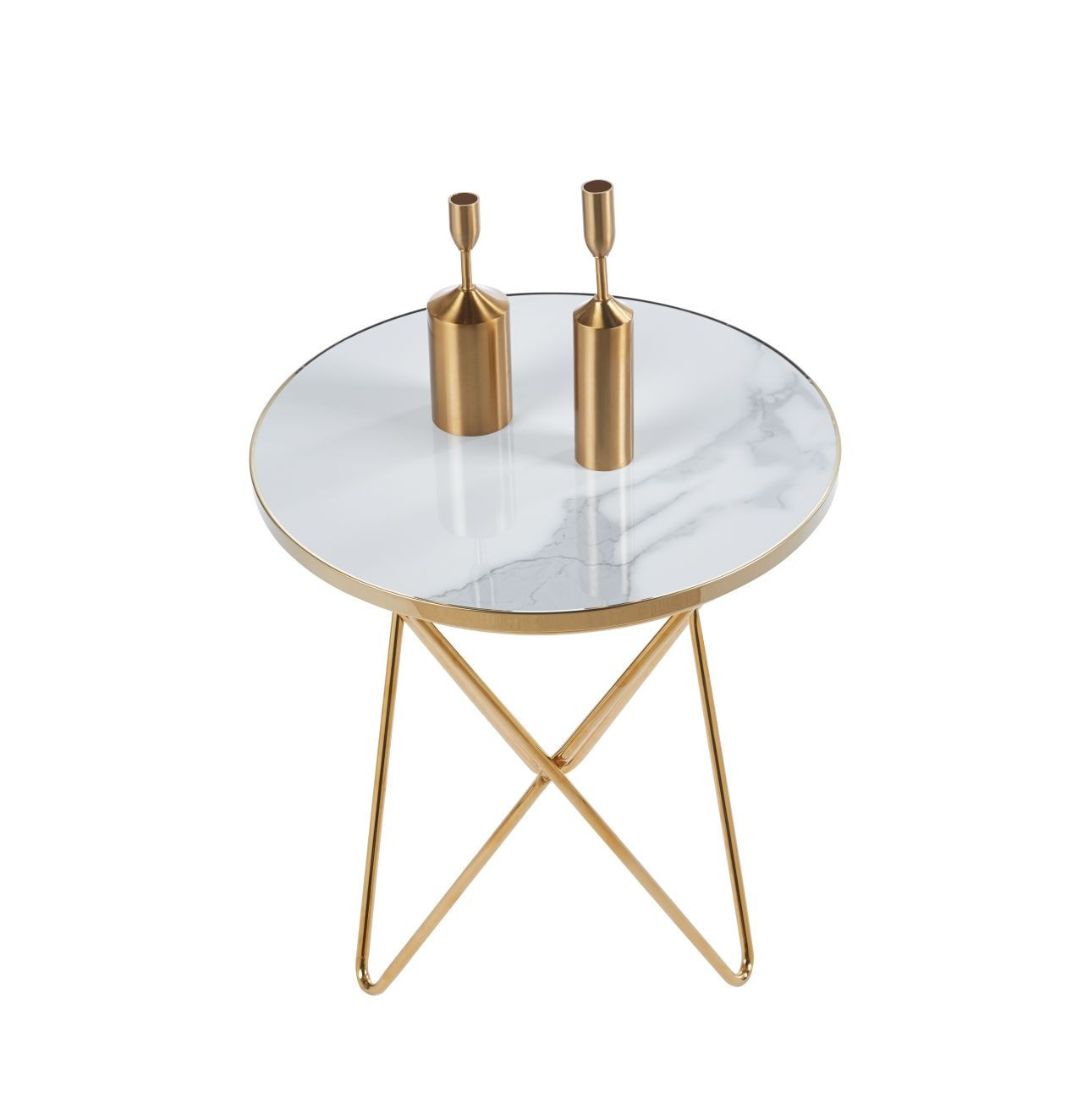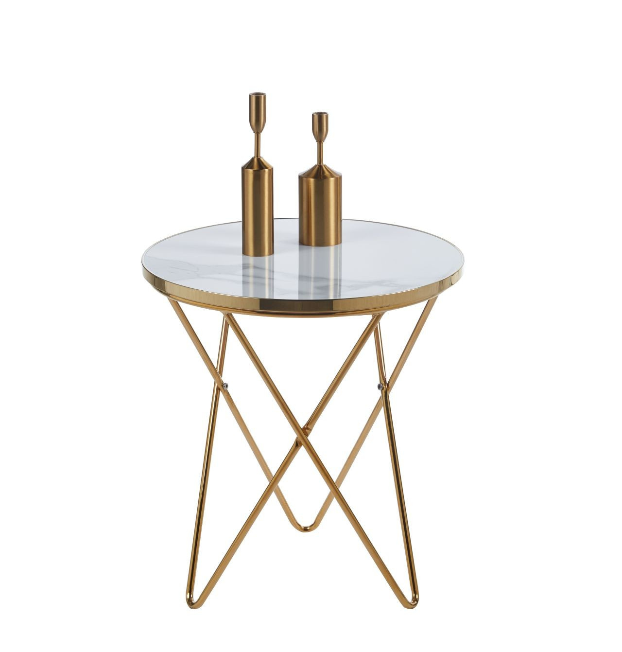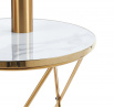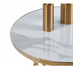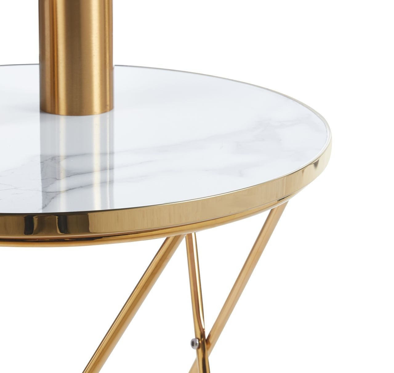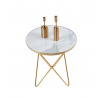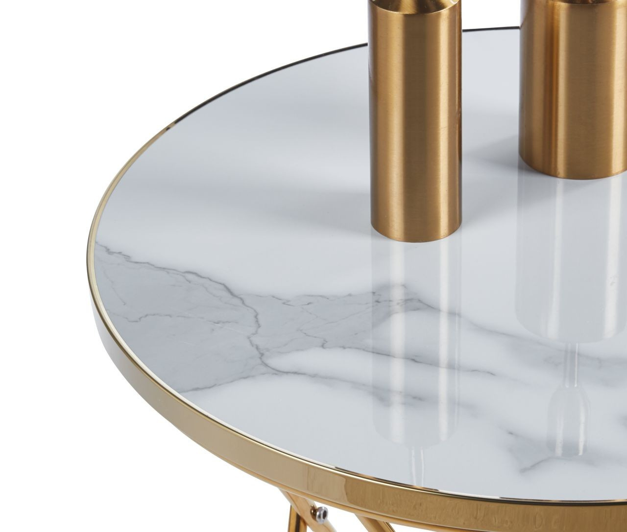 Rozmery: - doska: priemer 50 cm - výška: 55 cm Materiál: - doska: sklo - základňa: chrómovaný kov Farba: - doska: biely mramor - základňa: zlatá