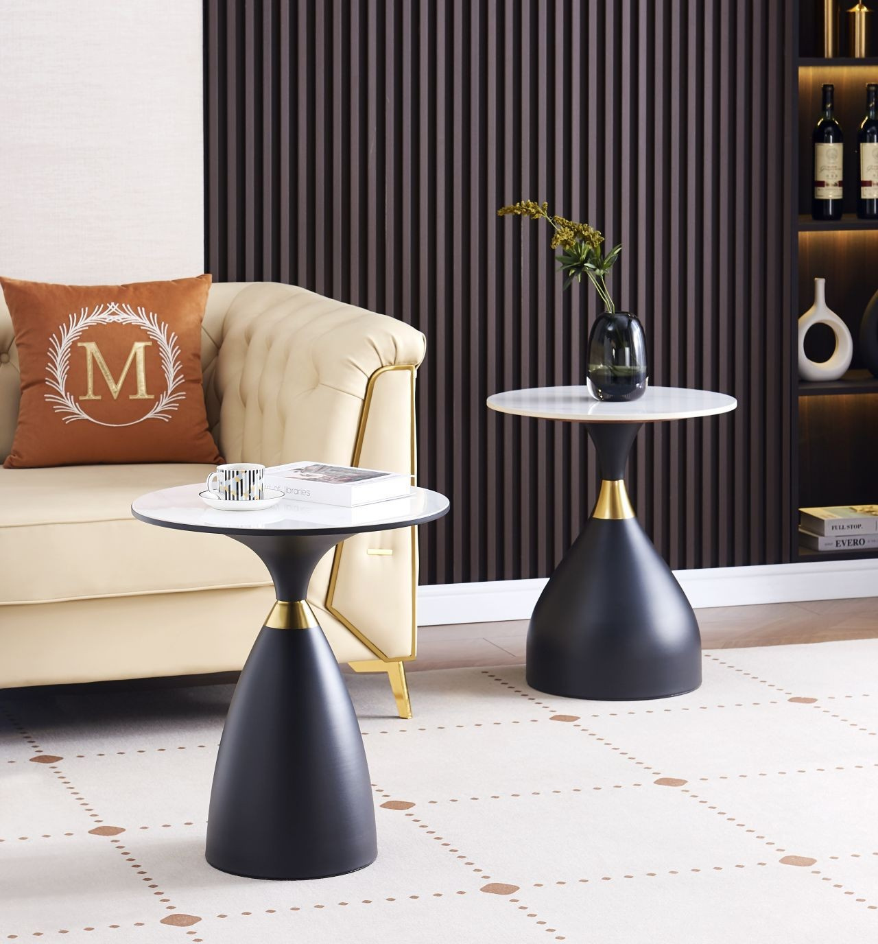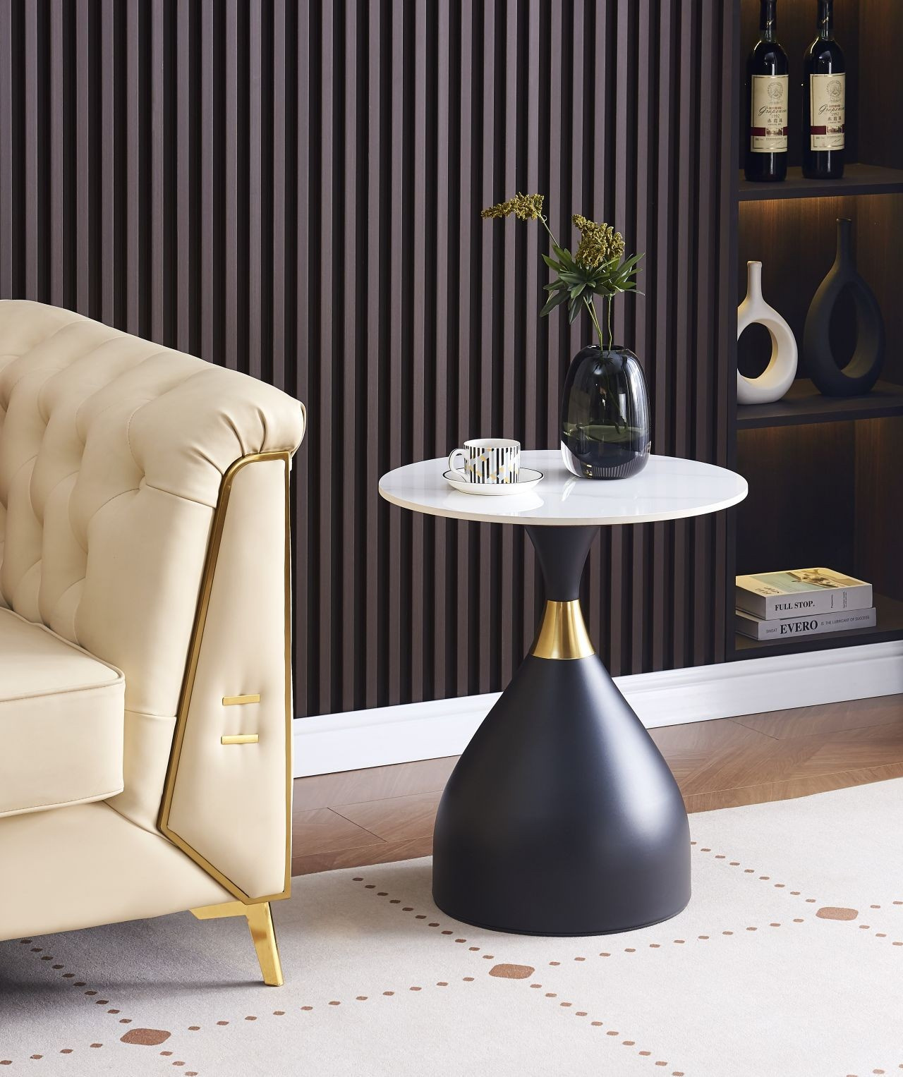 Rozmery: - priemer dosky: 50 cm - výška: 57 cm - podrobné rozmery na poslednej fotografii Materiál: - doska: keramika - základňa: kov s práškovým nástrekom Farba: - doska: biely mramor - základňa: čierna + zlatá dekorácia