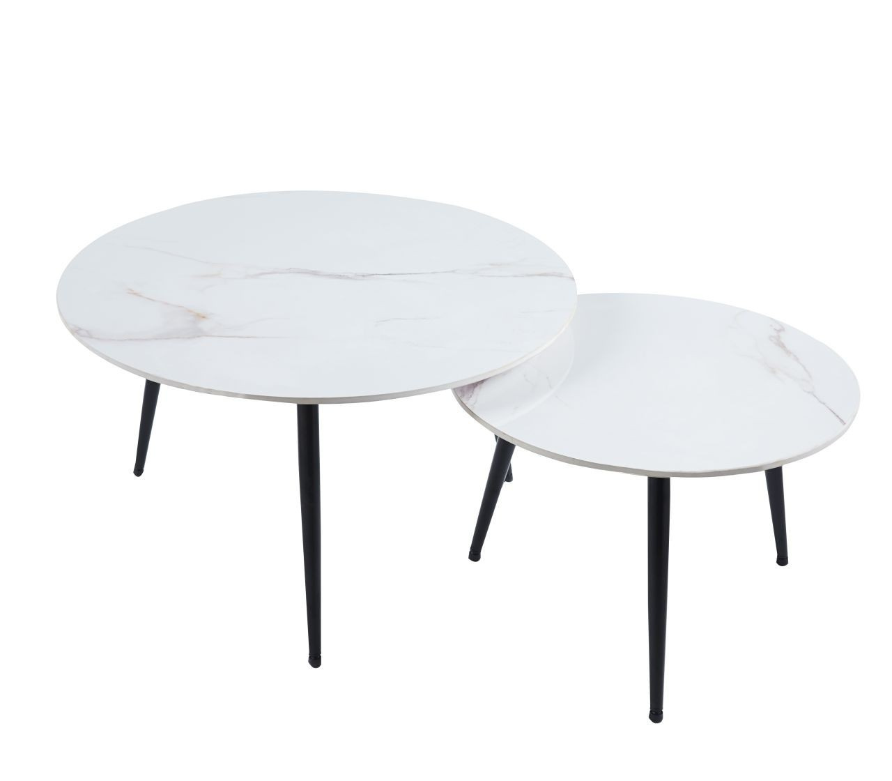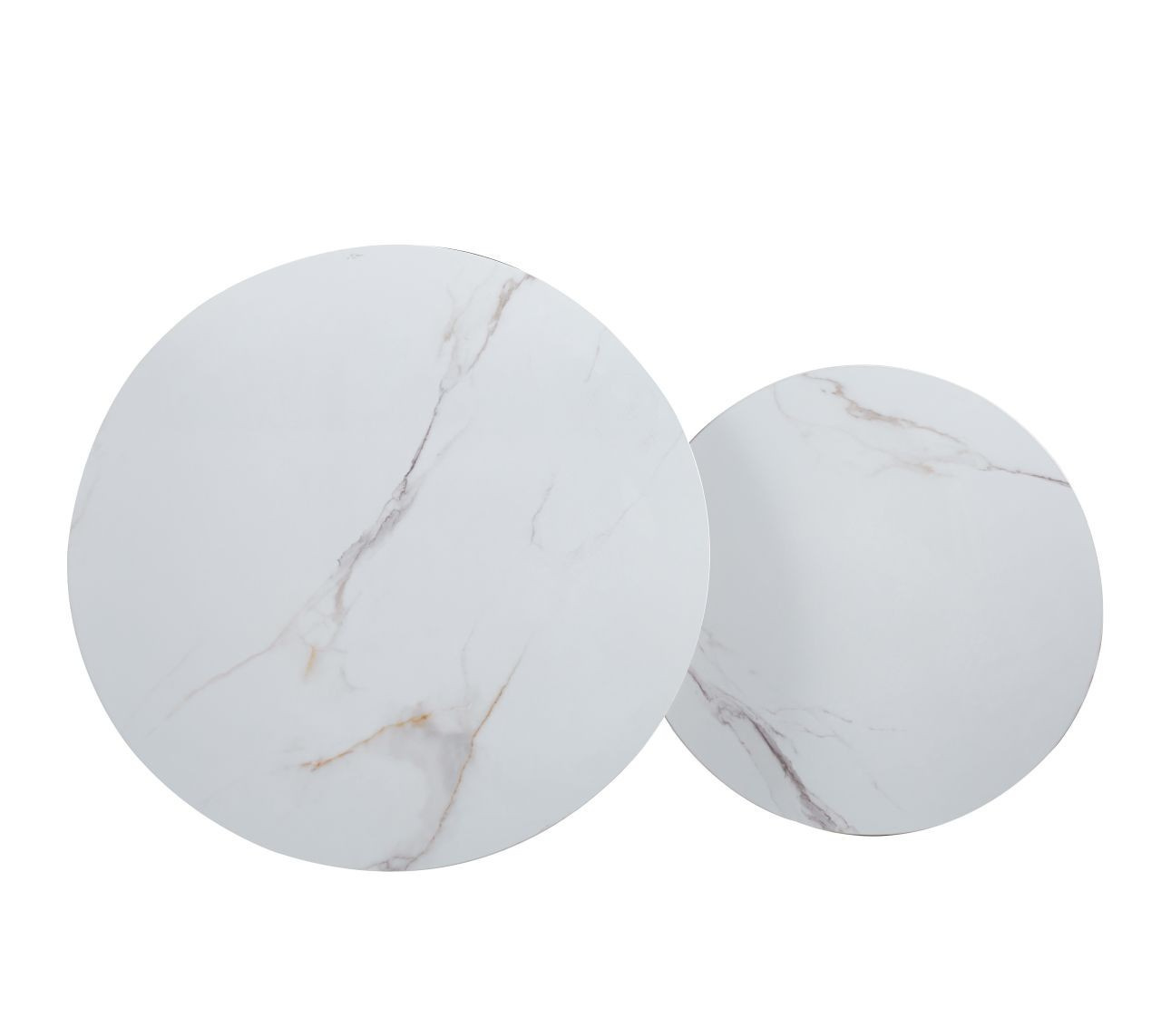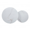 Rozmery: *väčší stolík: - doska: priemer 80 cm - výška: 45 cm *menší stolík: - doska: priemer 60 cm - výška: 40 cm Materiál: - doska: keramika (lesk) - nohy: kov lakovaný práškovou farbou Farba: - dosky: biely mramor - konštrukcia: čierna