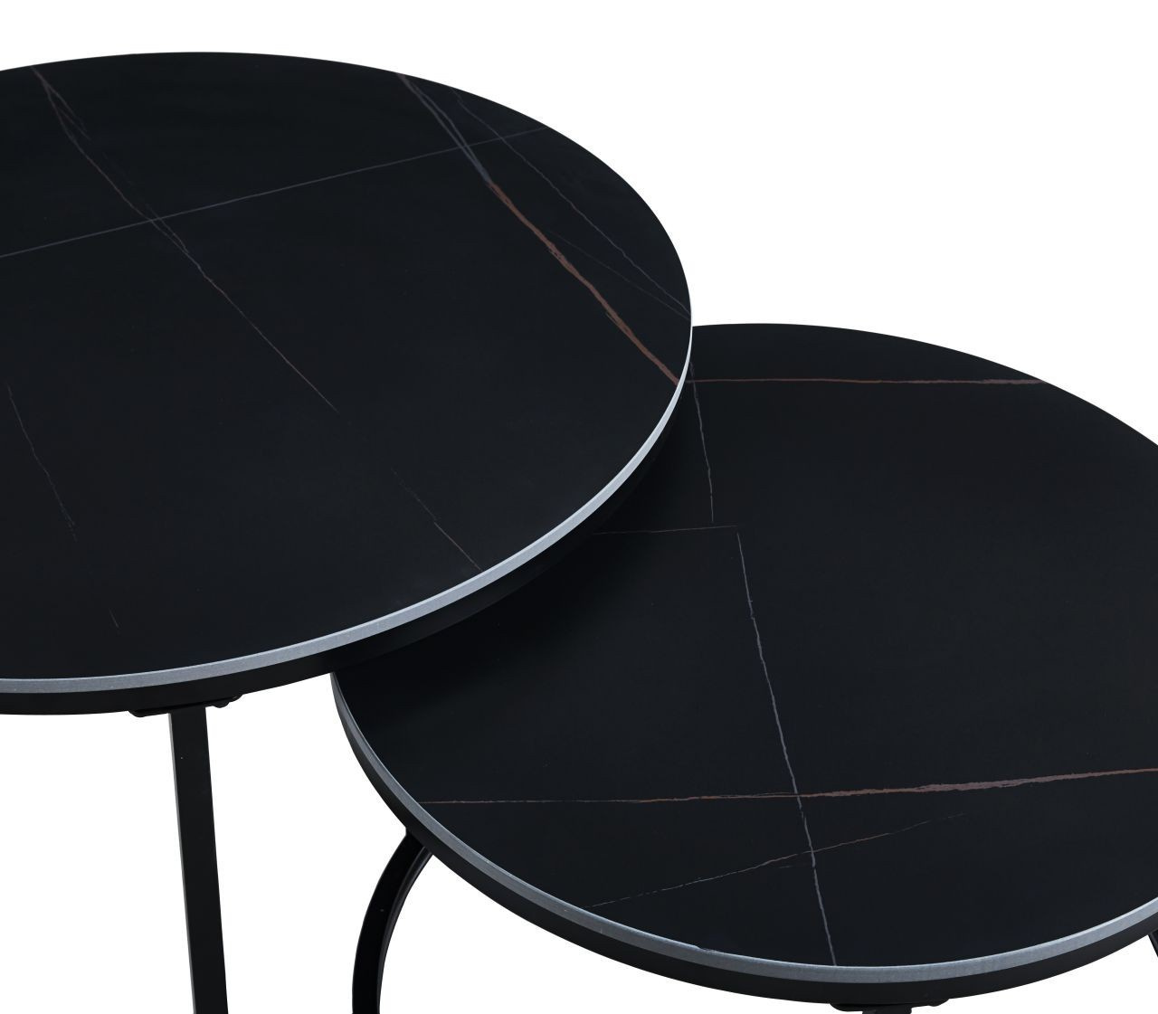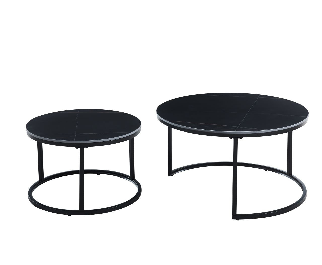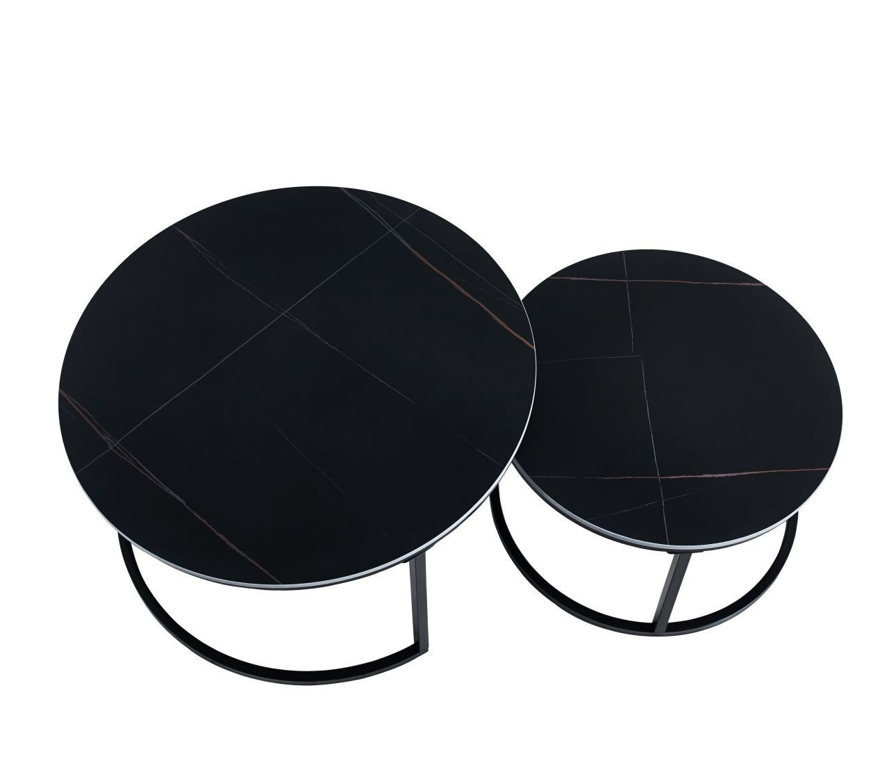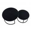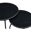 Rozmery: *väčší stolík: - doska: priemer 80 cm - výška: 44 cm *menší stolík: - doska: priemer 60 cm - výška: 38 cm Materiál: - doska: keramika (mat) - nohy: kov lakovaný práškovou farbou Farba: - dosky: čierne - konštrukcia: čierna