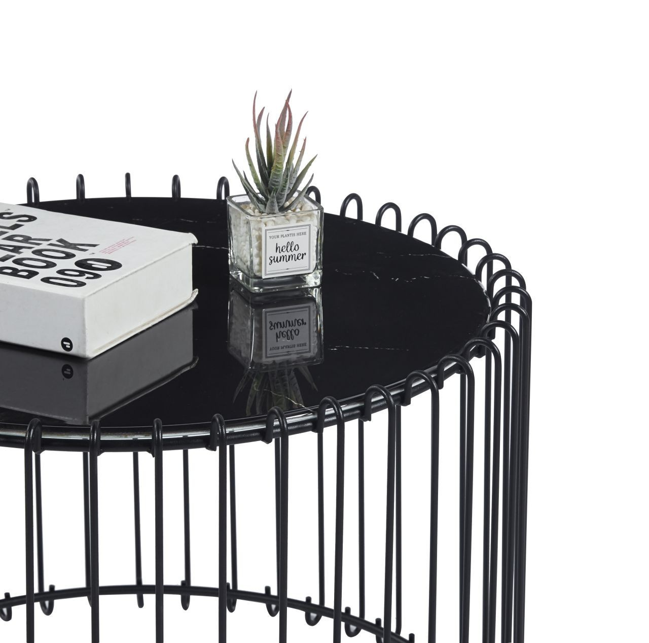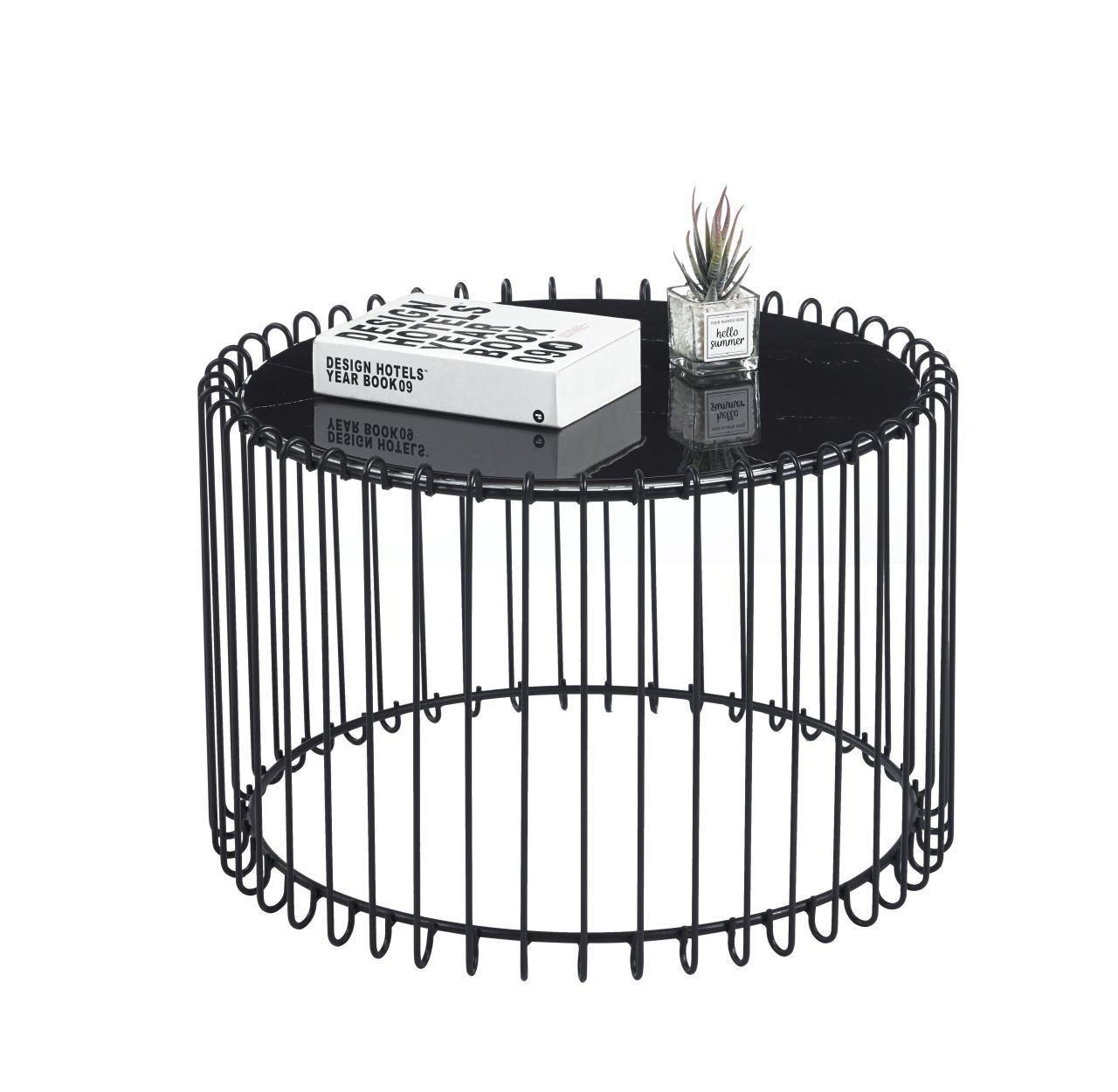 Rozmery: - doska: priemer 60 cm - výška: 39 cm Materiál: - doska: sklo - základňa: kov lakovaný práškovou farbou Farba: - doska: čierny mramor - základňa: čierna