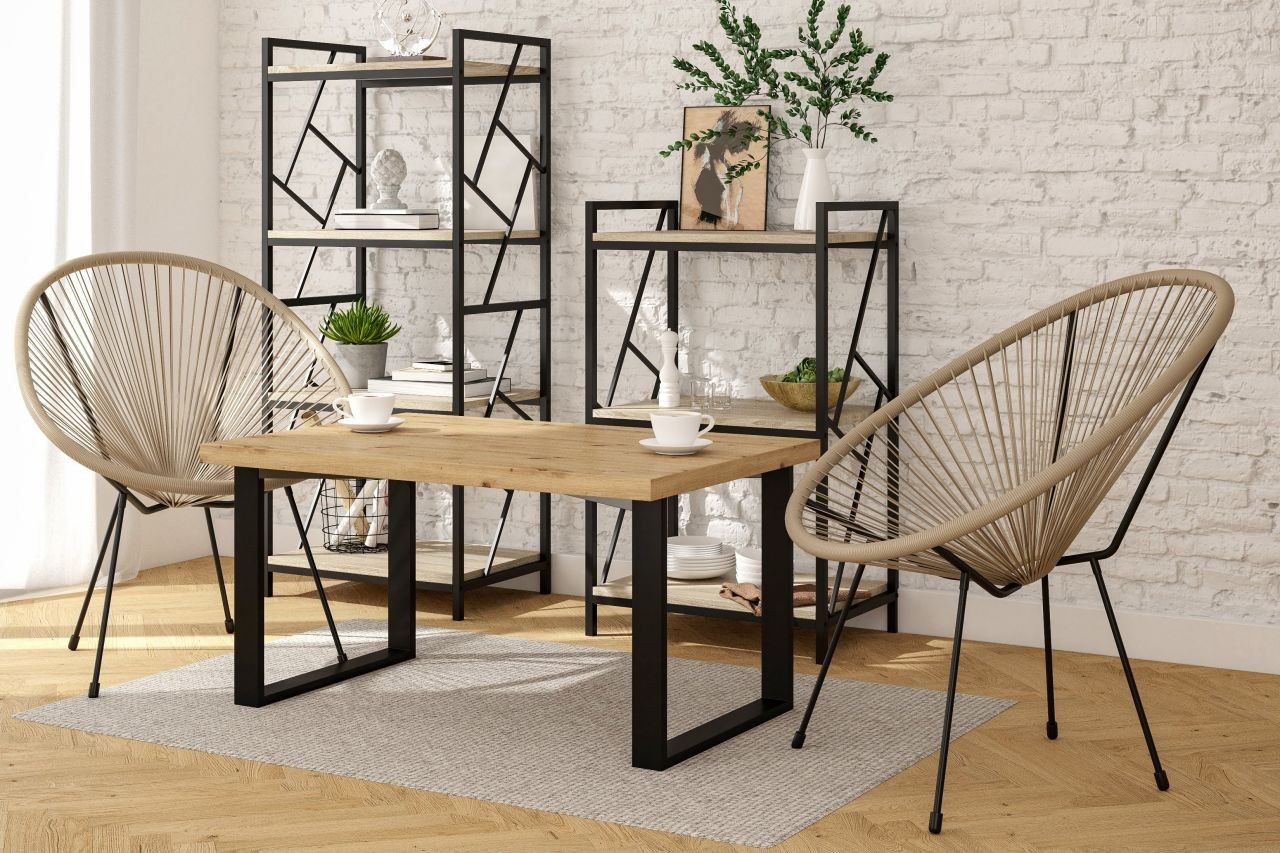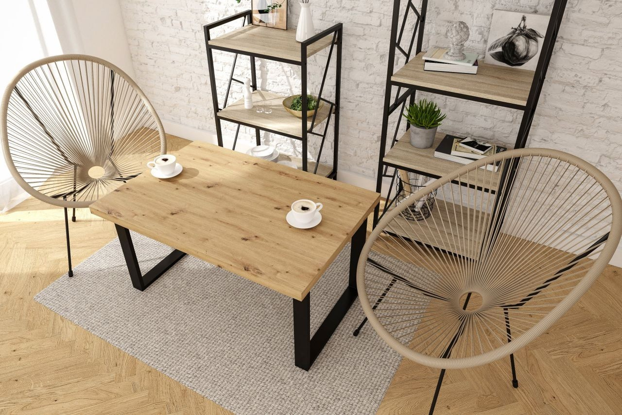 Rozmery: - dĺžka: 101 cm - šírka: 67 cm - výška: 52 cm - hrúbka dosky: 3,8 cm Materiál: - doska: laminovaná doska - hrany dosky: zakončené ABS plastom - nohy: oceľ lakovaná práškovou farbou Farba: - doska: dub artisan - nohy: čierna
