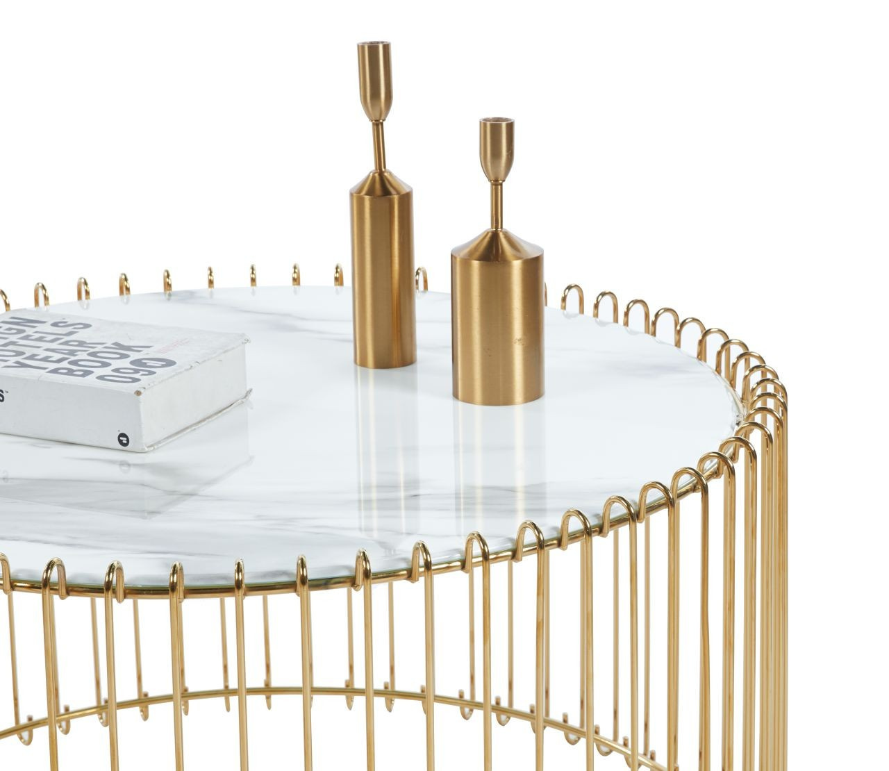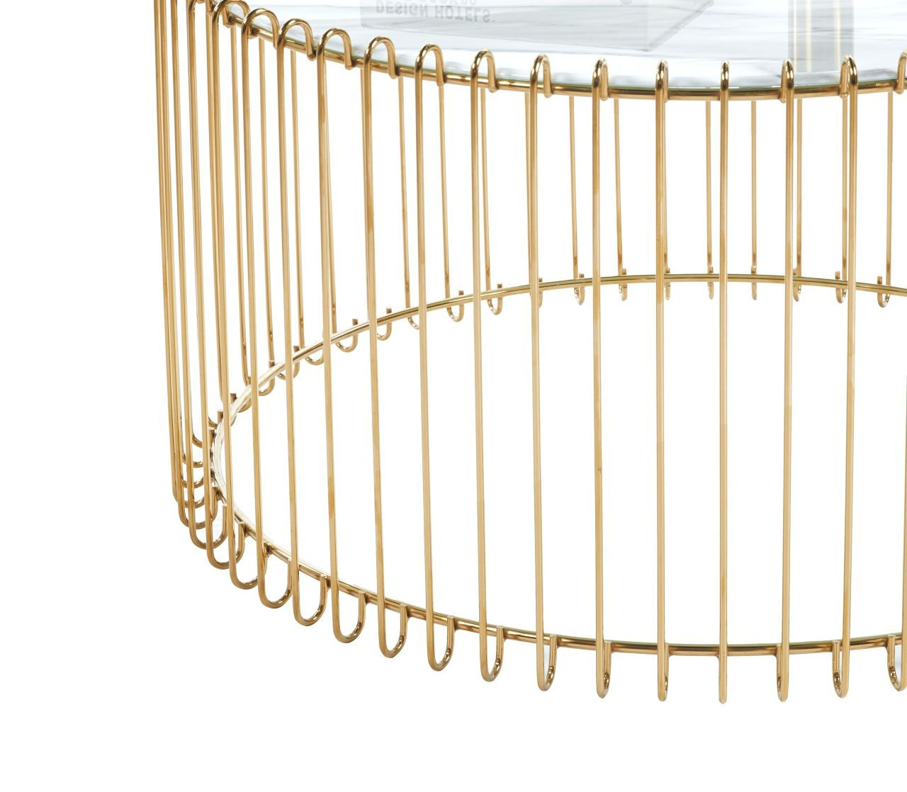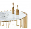 Rozmery: - doska: priemer 80 cm - výška: 42 cm Materiál: - doska: sklo - základňa: chróm Farba: - doska: biely mramor - základňa: zlatá