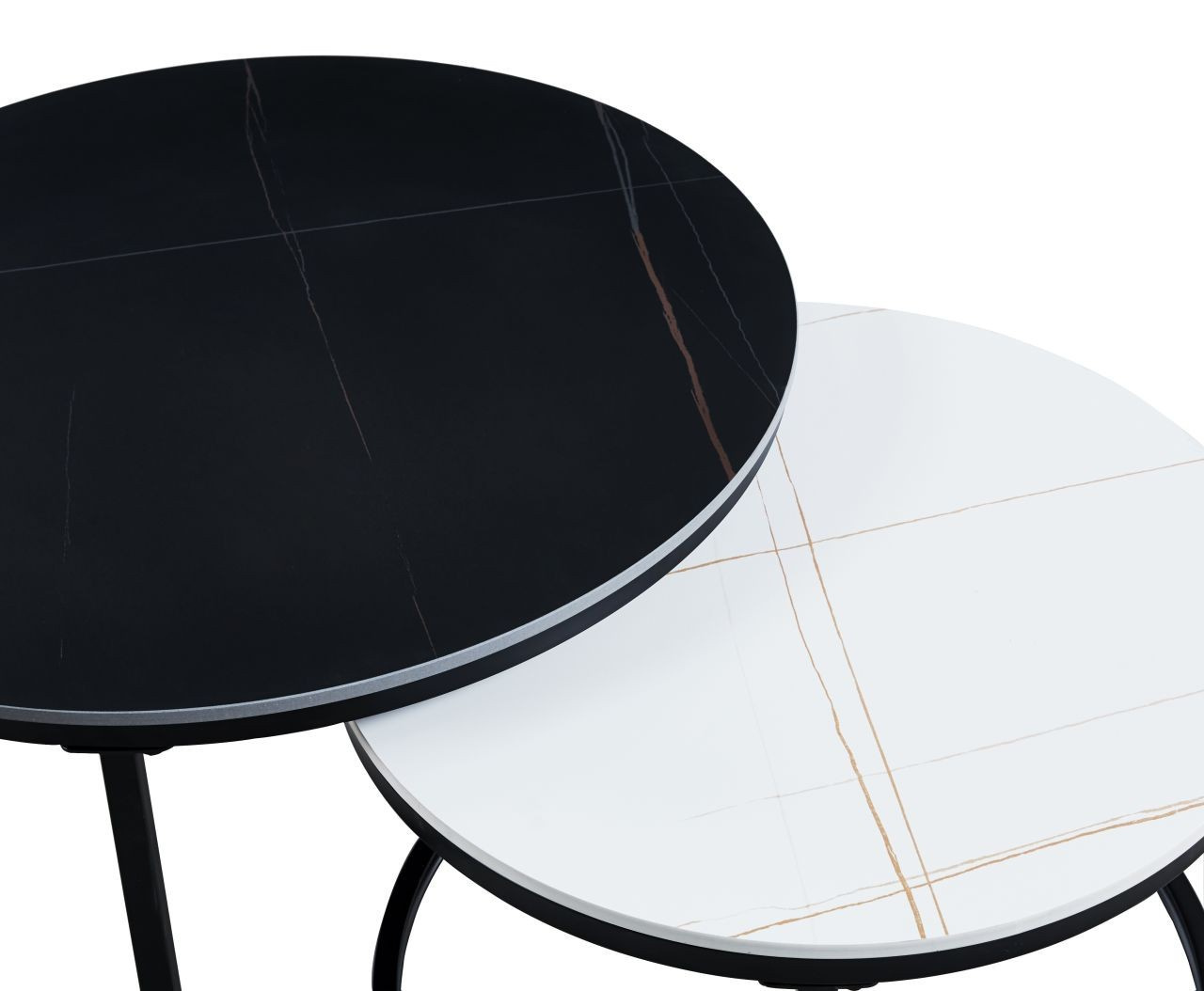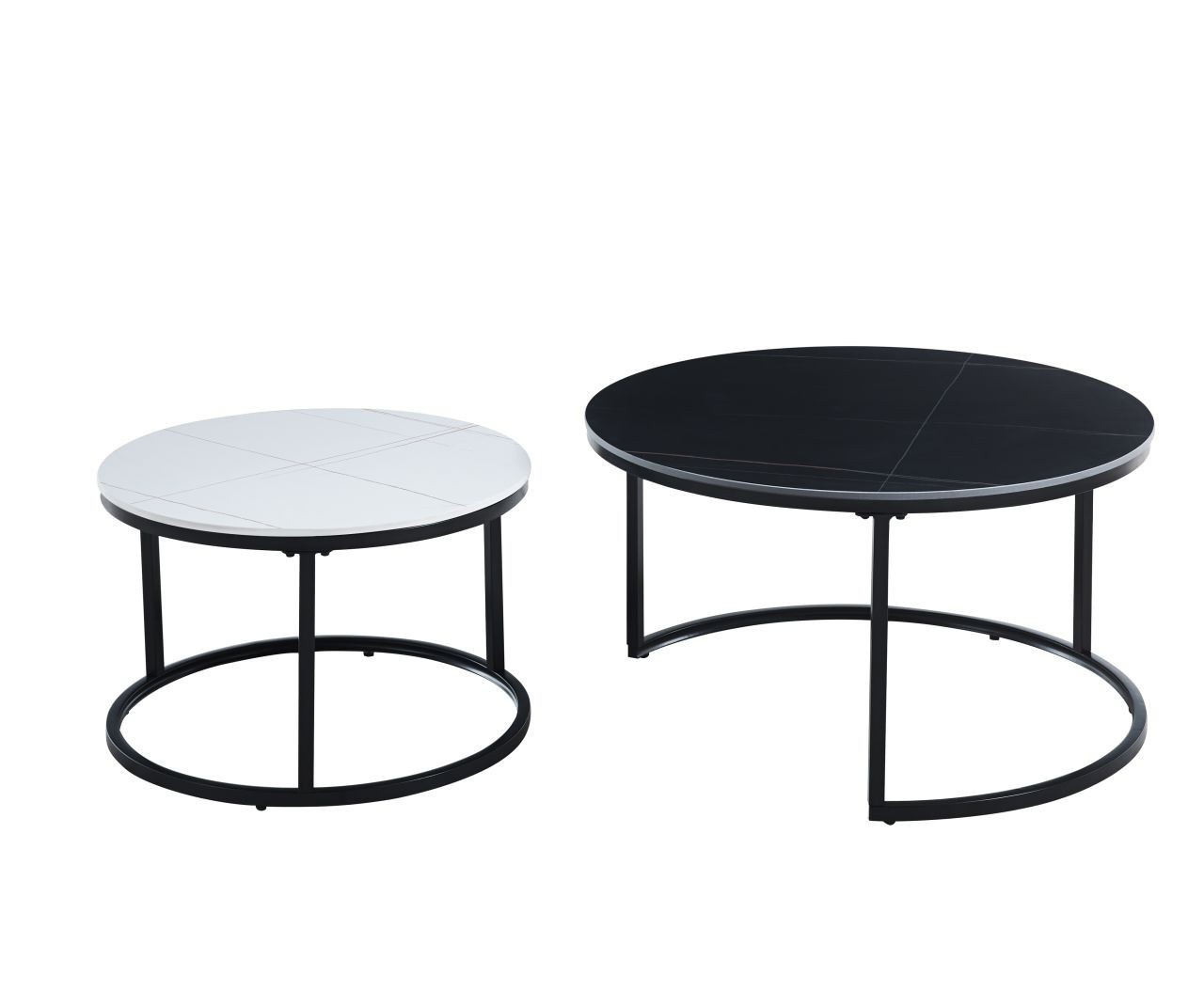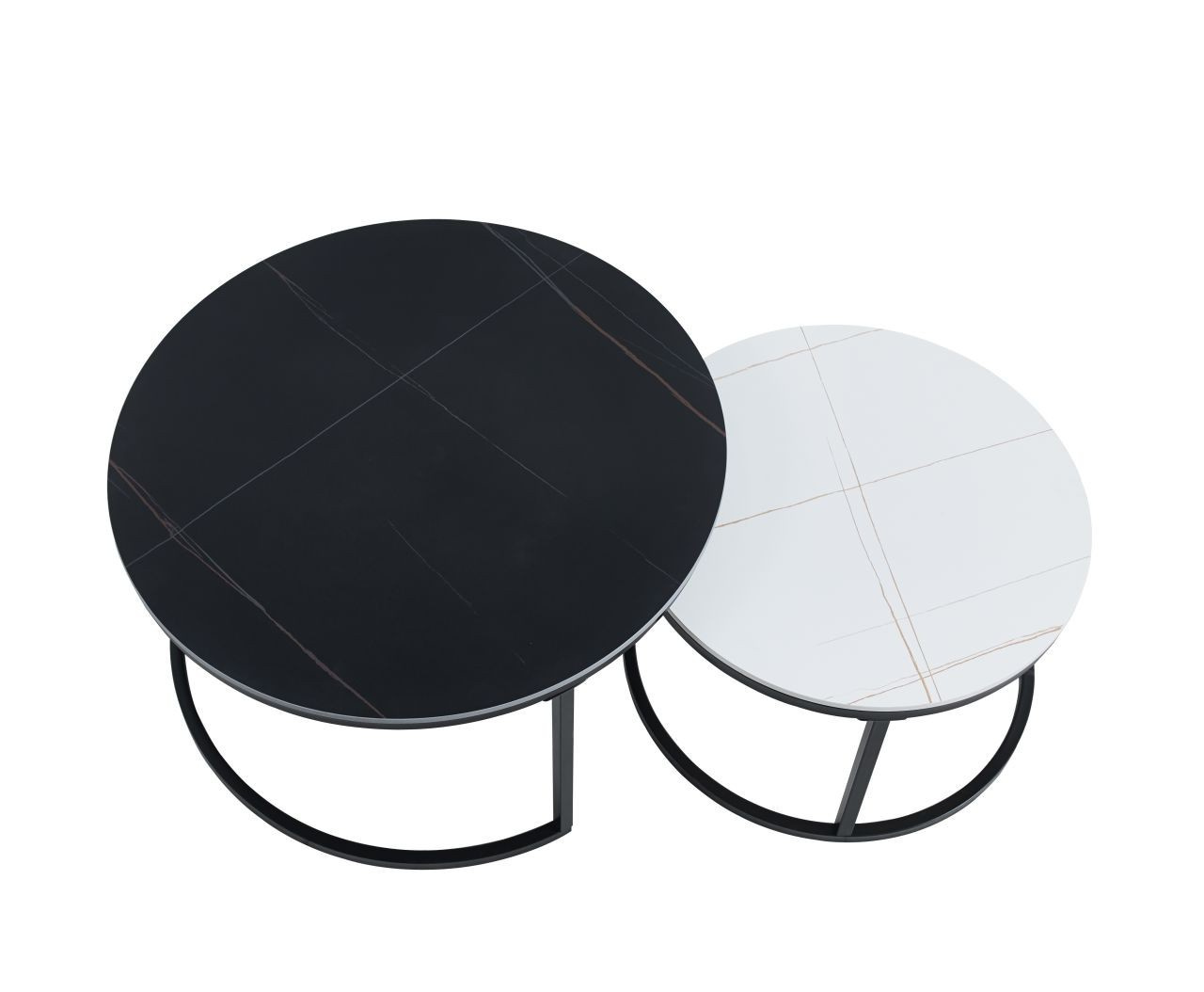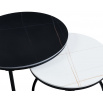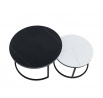 Rozmery: *väčší stolík: - doska: priemer 80 cm - výška: 44 cm *menší stolík: - doska: priemer 60 cm - výška: 38 cm Materiál: - doska: keramika (mat) - nohy: kov lakovaný práškovou farbou Farba: - dosky: čierna (80) + biela (60) - konštrukcia: čierna