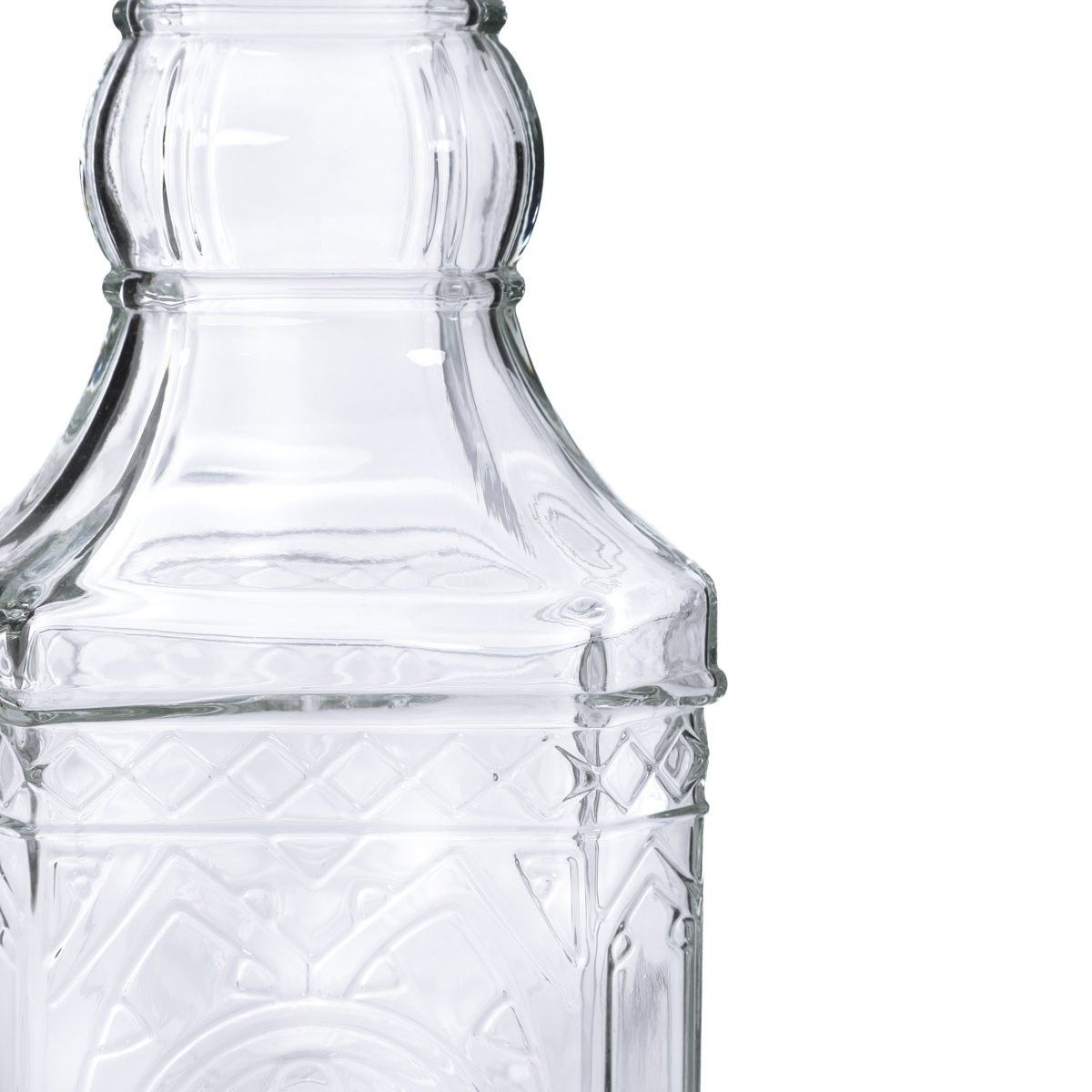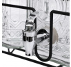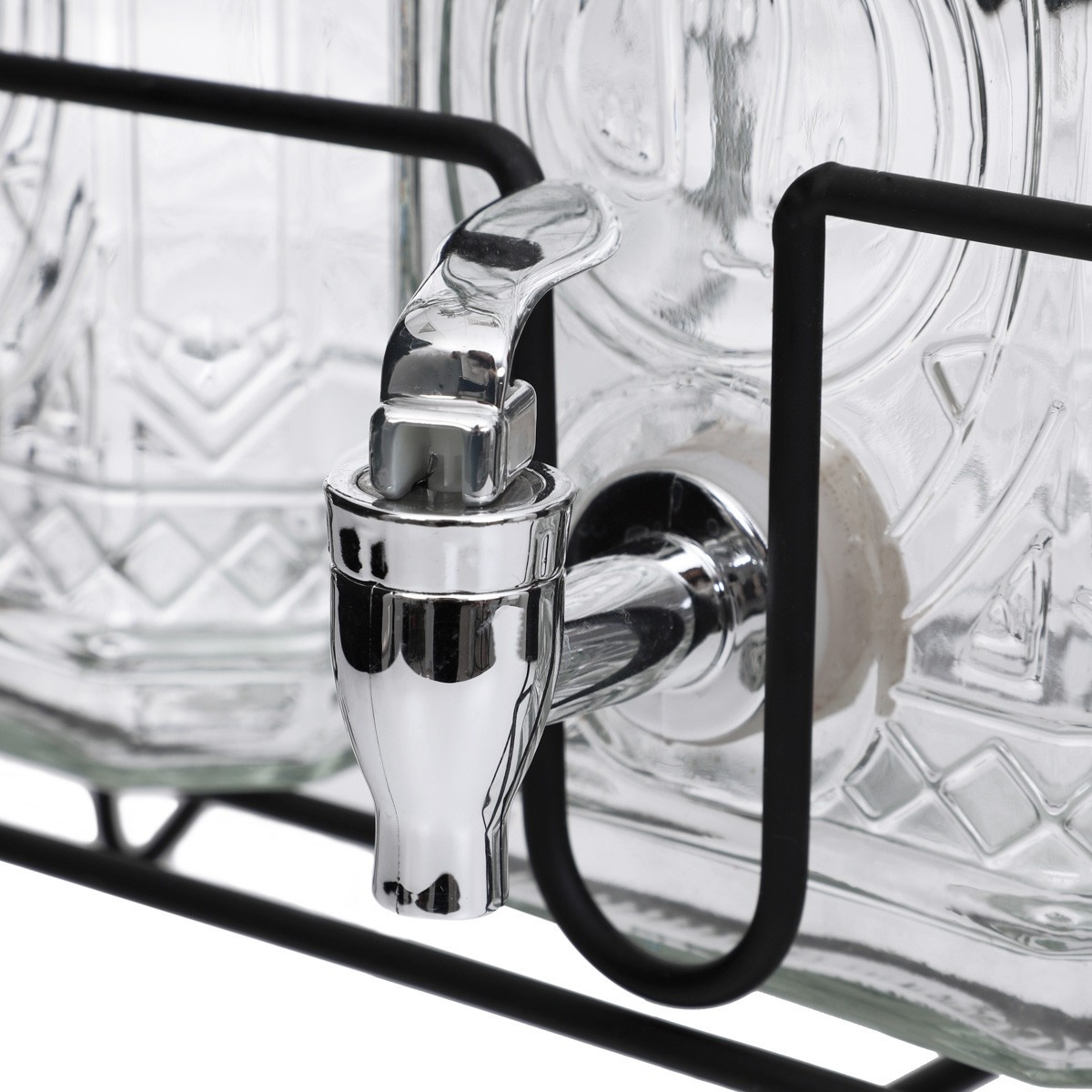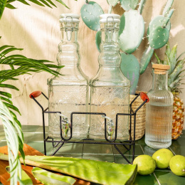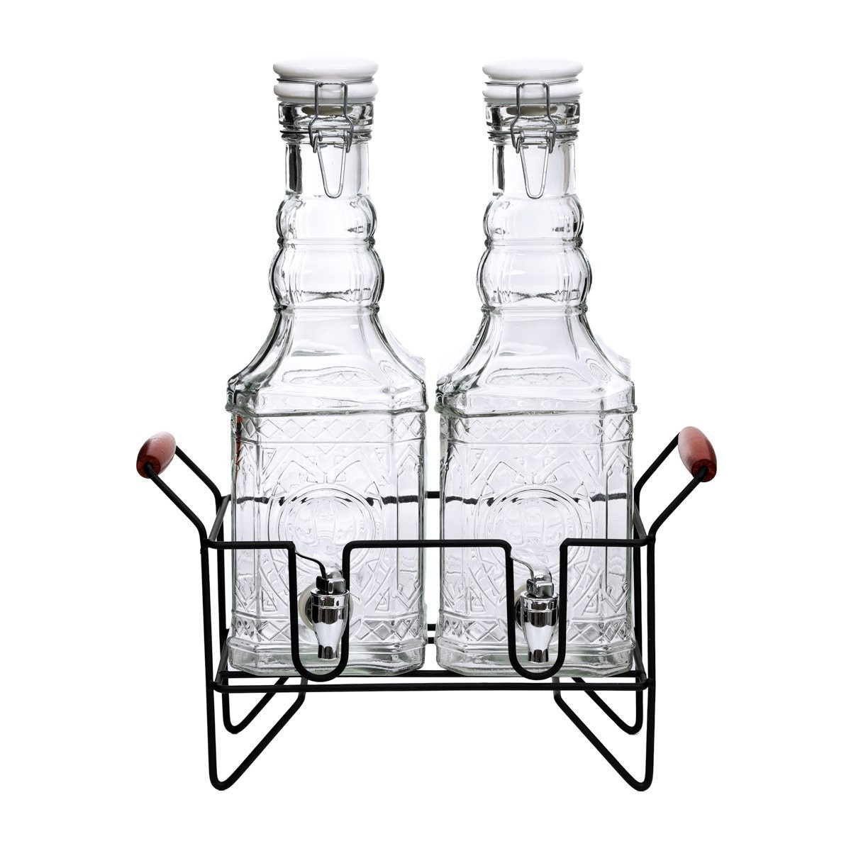 Fľaše sú vyrobené z hrubého skla, ktoré je odolné a odolné proti poškriabaniu. Sú uzavreté plastovými uzávermi a pohodlné dávkovanie je zabezpečené kovovými kohútikmi. Vyrobili sme tiež stojan z kovu, ktorý je stabilný a umožňuje pohodlné umiestnenie pohára pod kohútik.