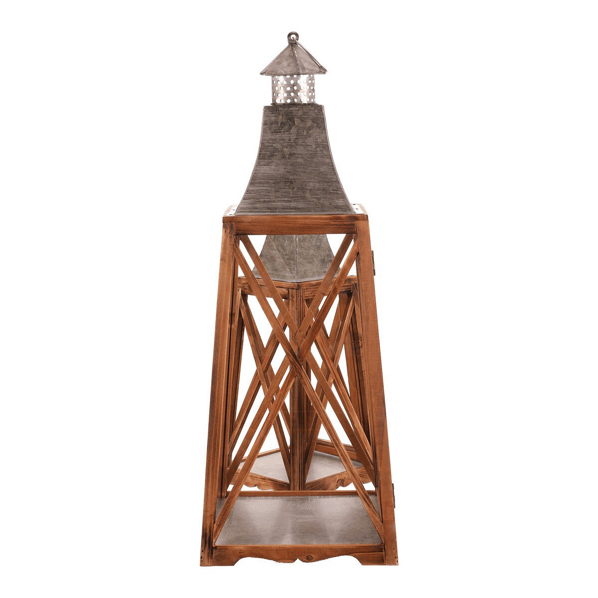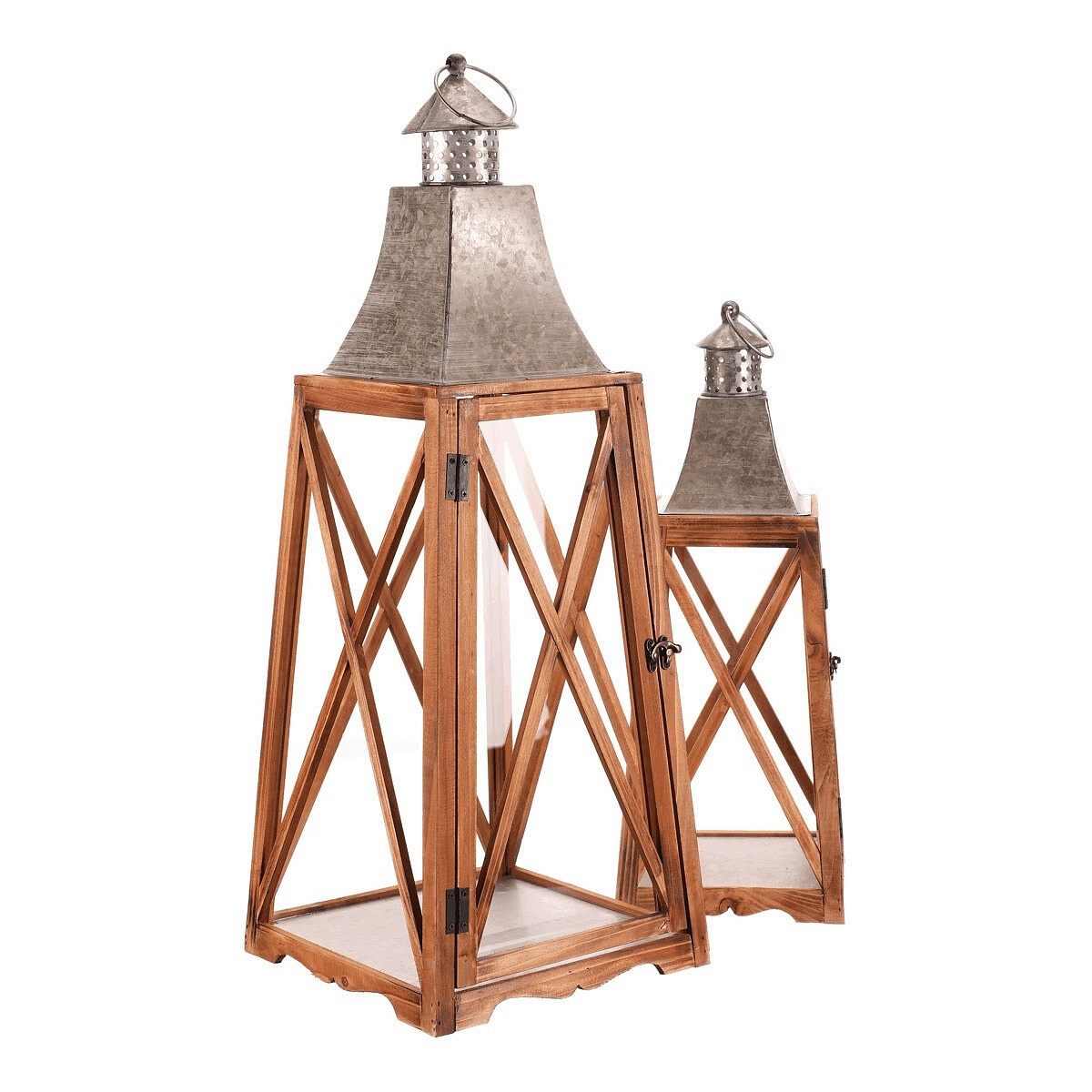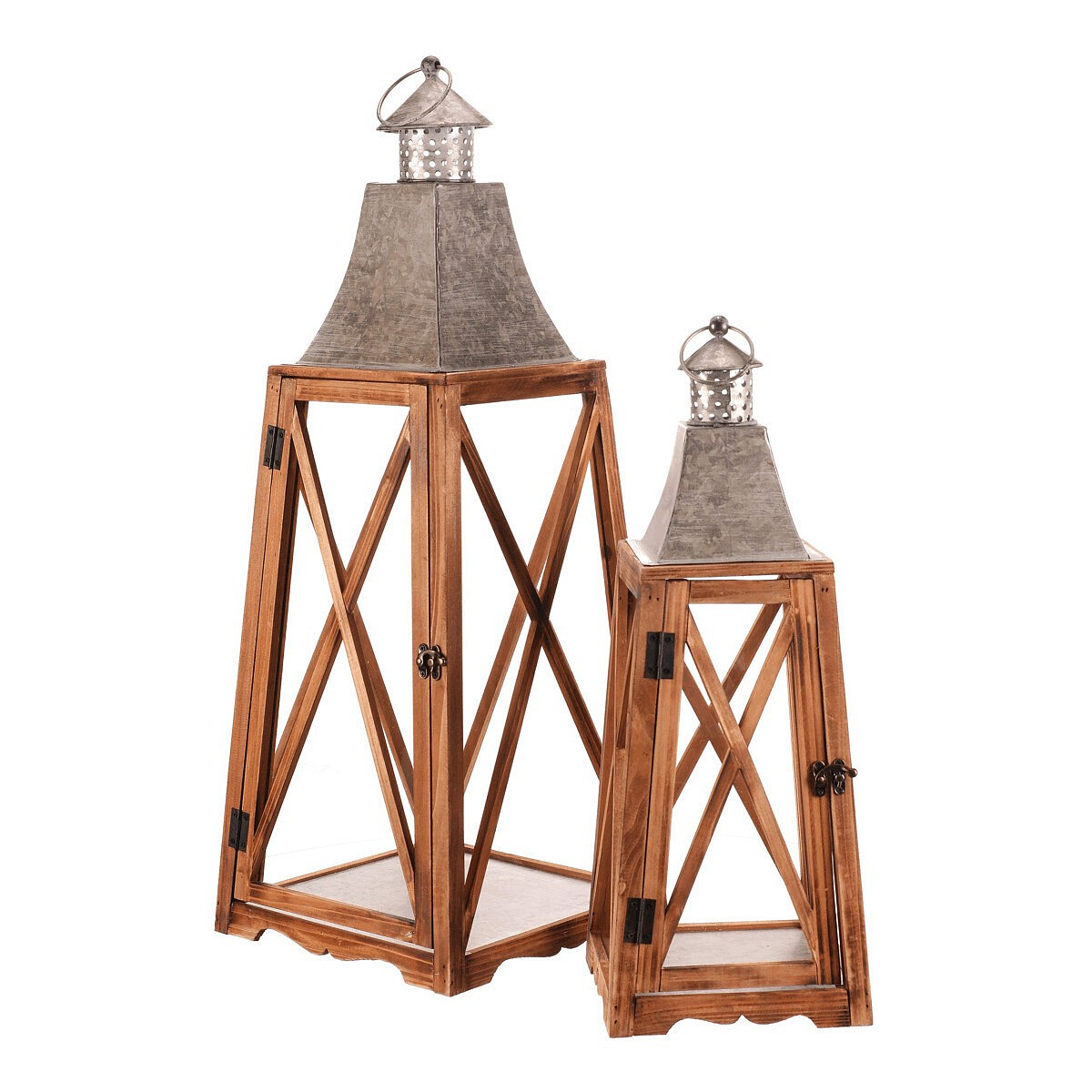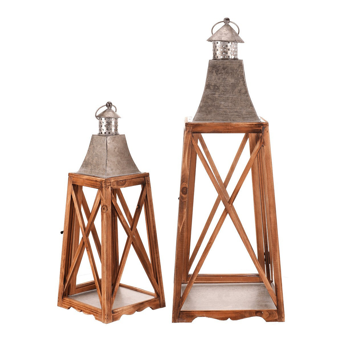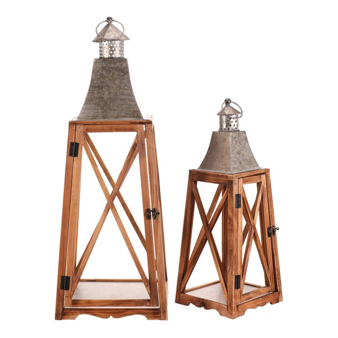 Tato čtyřboká dřevěná lucerna ve tvaru jehlanu je k dispozici v sadě dvou velikostí, které dodají vašemu prostoru příjemné světlo a stylový nádech. Rámy v přírodní barvě dřeva ladí s kovovým vrškem ve stříbrném odstínu, což lucernám přidává elegantní kontrast. Díky kroužku na vrcholu je snadno zavěsíte a přenesete tam, kam je třeba.