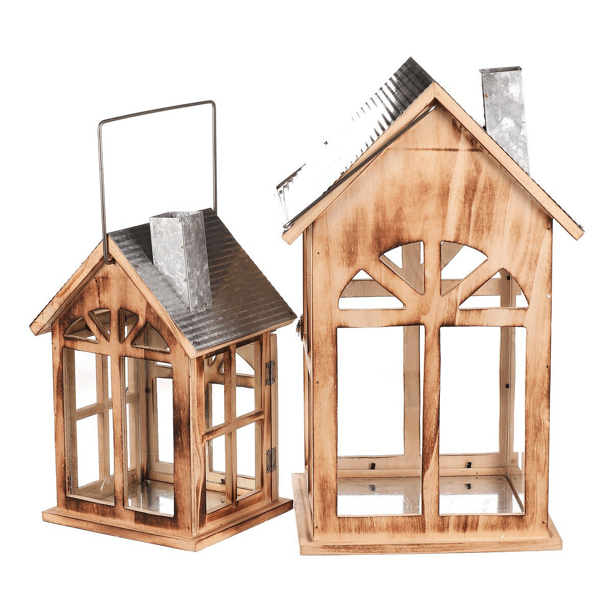 Dřevěná lucerna ve tvaru domku vnese do vašeho domova hřejivou atmosféru. Přírodní barva dřeva s nádhernou texturou působí rustikálně, zatímco plechová stříbrná stříška dodává eleganci. Díky proskleným stěnám krásně rozptyluje světlo svíčky. Můžete ji postavit na stůl či polici nebo pověsit za kovové madlo. Jedná se o sadu dvou velikostí o stejném stylu.