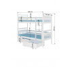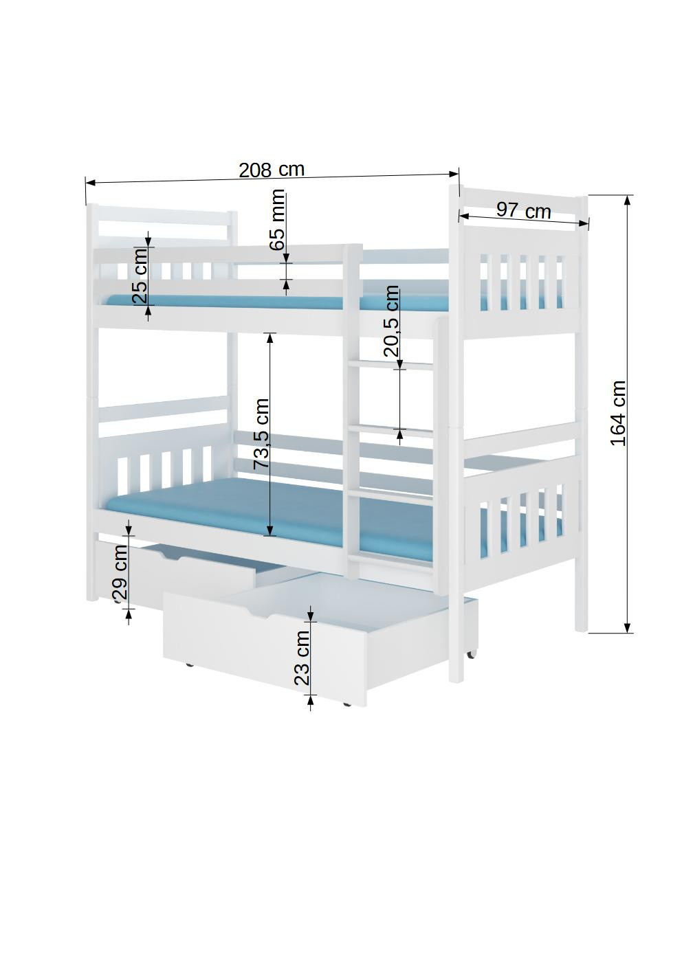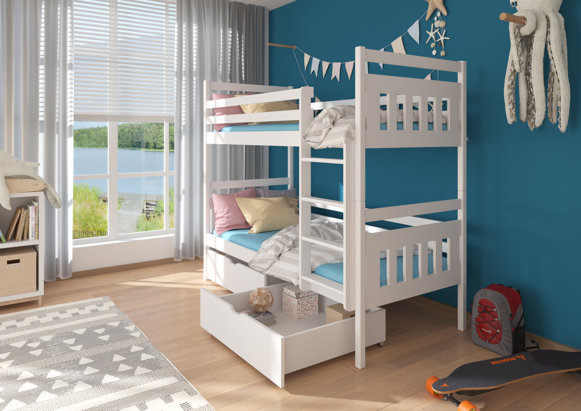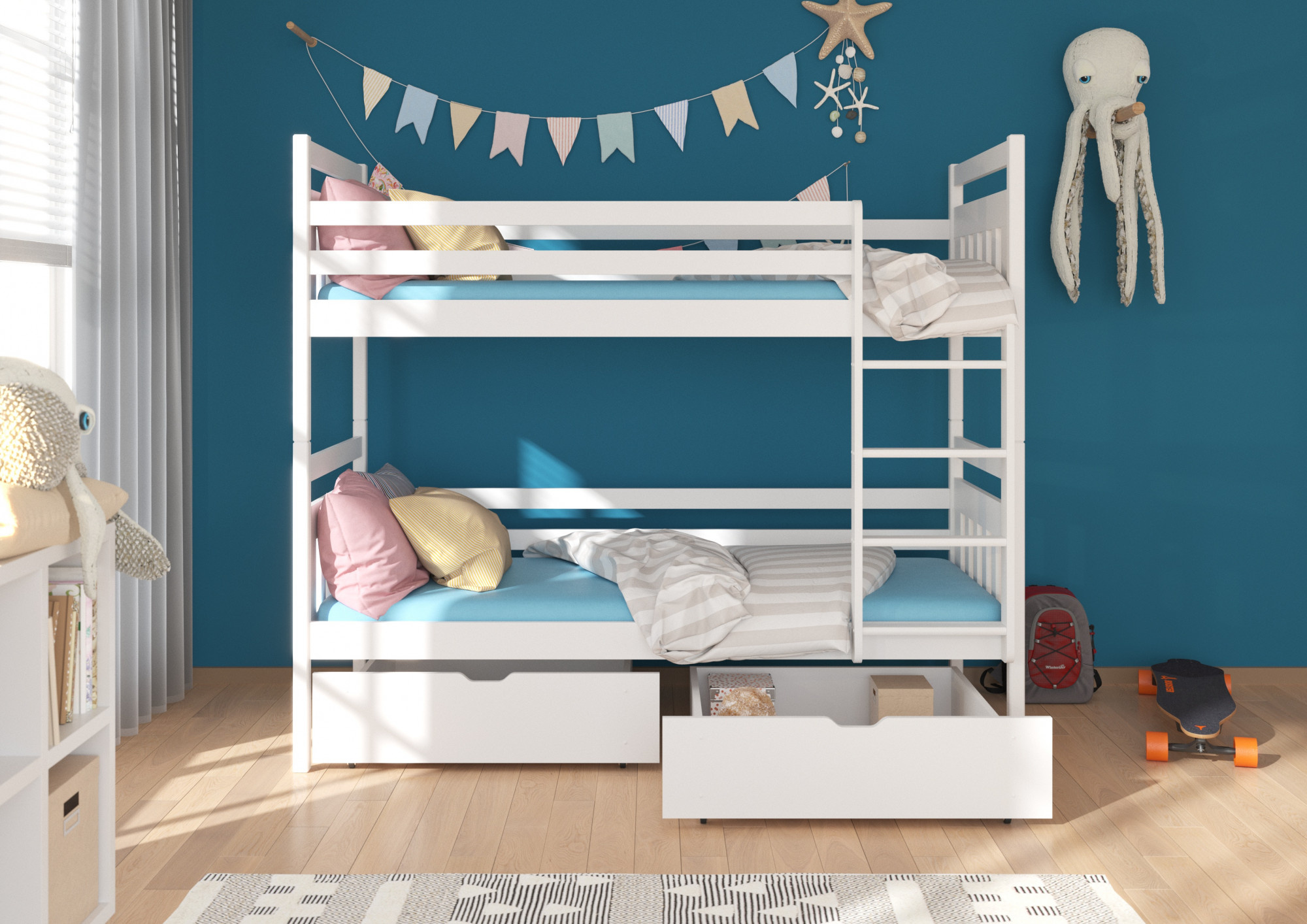 Poschodová 2-osobová posteľ ADA je skvelý nápad na úsporu miesta v malej detskej izbe. Model je dostupný v dvoch veľkostiach a v mnohých farbách, ktoré sa hodia do každého usporiadania. Nábytok obsahuje schodíkový rebrík a dve priestranné a funkčné zásuvky na posteľnú bielizeň. Matrace nie sú súčasťou postele.