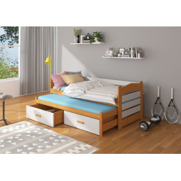 Dvojlôžko TIARRO je ideálnym riešením v izbe pre dvoch súrodencov. Dokonale sa osvedčí aj v prípade návštevy nečakaných hostí. Model je dostupný v dvoch veľkostiach a v mnohých farbách, ktoré sa hodia do každého usporiadania. Posteľ má dve praktické a funkčné zásuvky na posteľnú bielizeň a odolný a pevný rám vyrobený z borovicového dreva. Spolu s posteľou obdržíš sadu penových matracov o hrúbke 8 cm.