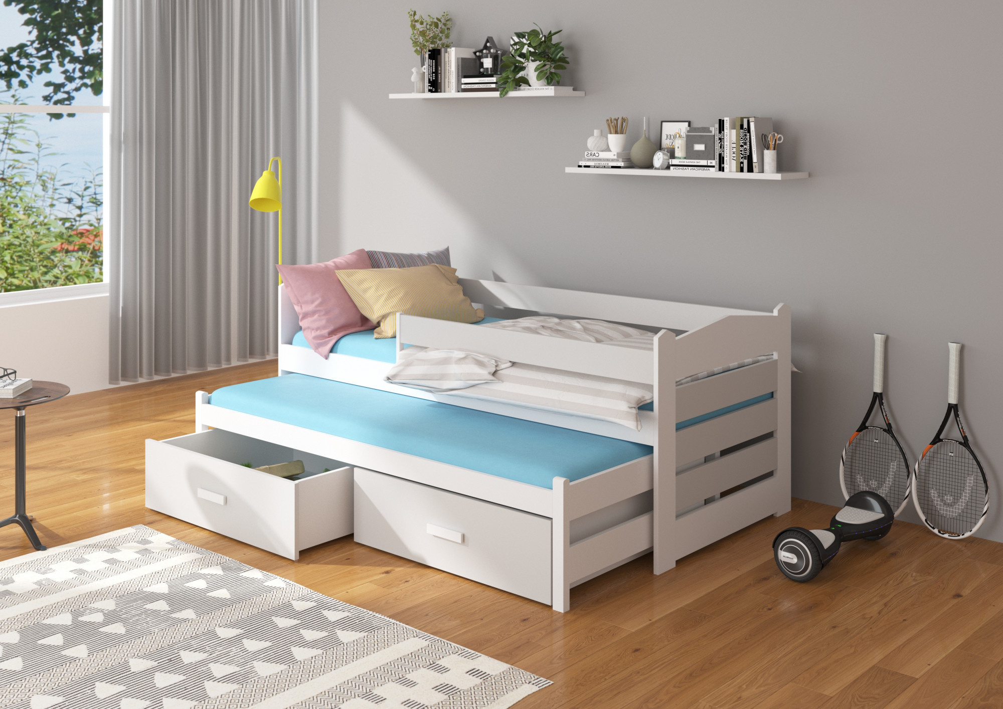 Dvojlôžko s bariérkou TIARRO je ideálnym riešením do izby pre dvoch súrodencov. Dokonale sa osvedčí aj v prípade návštevy nečakaných hostí. Model je dostupný v dvoch veľkostiach a v mnohých farbách, ktoré sa hodia do každého usporiadania. Posteľ má dve praktické a funkčné zásuvky na posteľnú bielizeň a odolný a pevný rám vyrobený z borovicového dreva. Pre zvýšenie bezpečnosti vášho dieťaťa bol model doplnený o ďalšie zábradlie chrániace pred pádom. Matrace nie sú súčasťou postele.