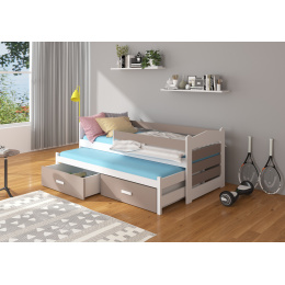 Dvojlôžko s bariérkou TIARRO je ideálnym riešením do izby pre dvoch súrodencov. Dokonale sa osvedčí aj v prípade návštevy nečakaných hostí. Model je dostupný v dvoch veľkostiach a v mnohých farbách, ktoré sa hodia do každého usporiadania. Posteľ má dve praktické a funkčné zásuvky na posteľnú bielizeň a odolný a pevný rám vyrobený z borovicového dreva. Pre zvýšenie bezpečnosti vášho dieťaťa bol model doplnený o ďalšie zábradlie chrániace pred pádom. Matrace nie sú súčasťou postele.