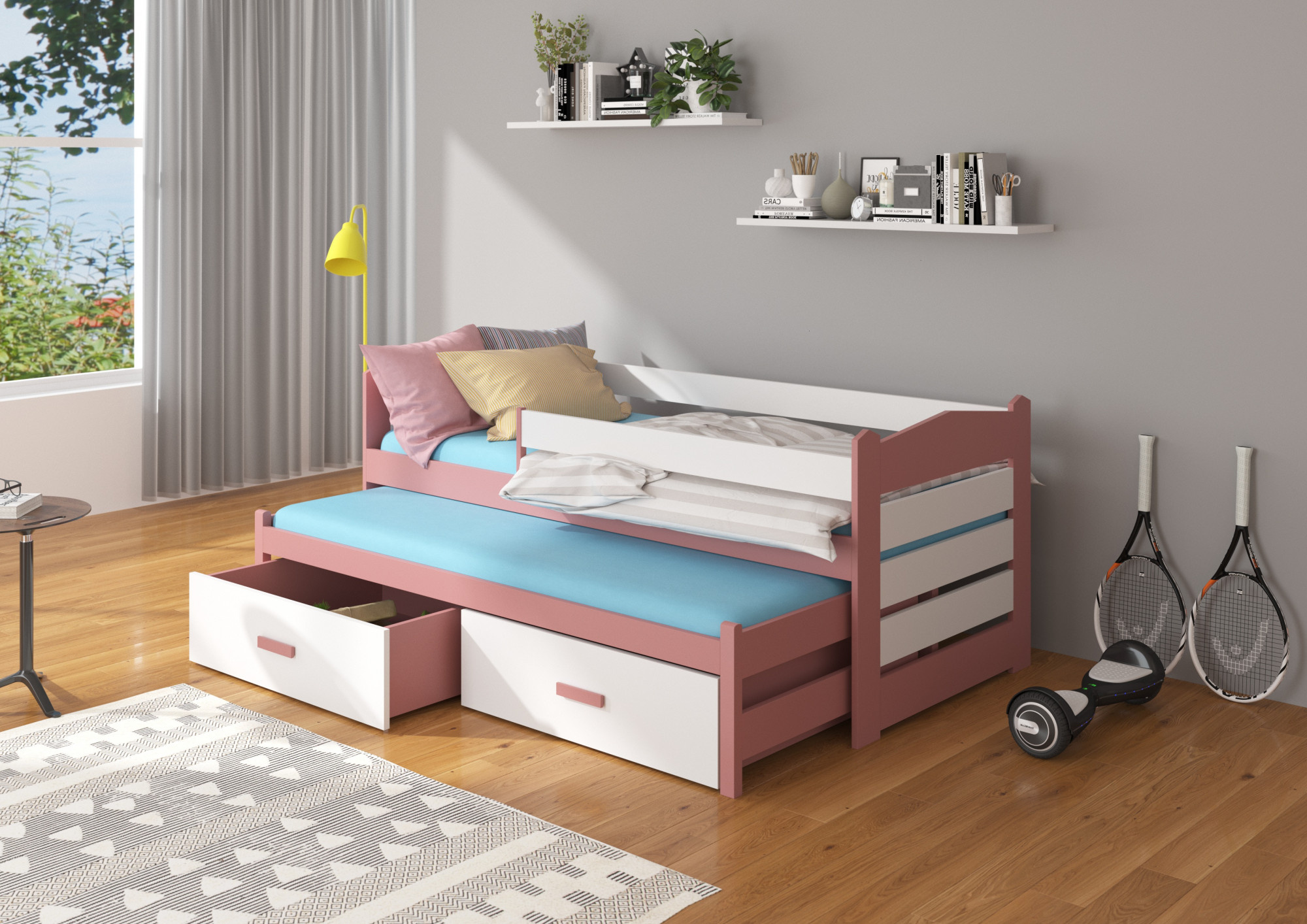 Dvojlôžko s bariérkou TIARRO je ideálnym riešením do izby pre dvoch súrodencov. Dokonale sa osvedčí aj v prípade návštevy nečakaných hostí. Model je dostupný v dvoch veľkostiach a v mnohých farbách, ktoré sa hodia do každého usporiadania. Posteľ má dve praktické a funkčné zásuvky na posteľnú bielizeň a odolný a pevný rám vyrobený z borovicového dreva. Pre zvýšenie bezpečnosti vášho dieťaťa bol model doplnený o ďalšie zábradlie chrániace pred pádom. Matrace nie sú súčasťou postele.